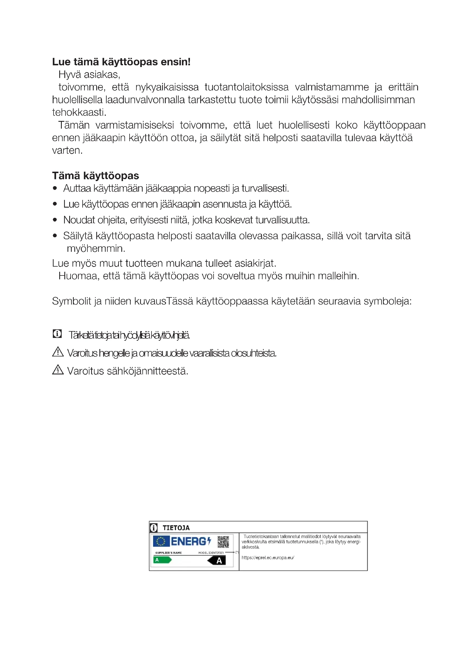 - Lue käyttöopas ennen jääkaapin asennusta ja käyttöä.