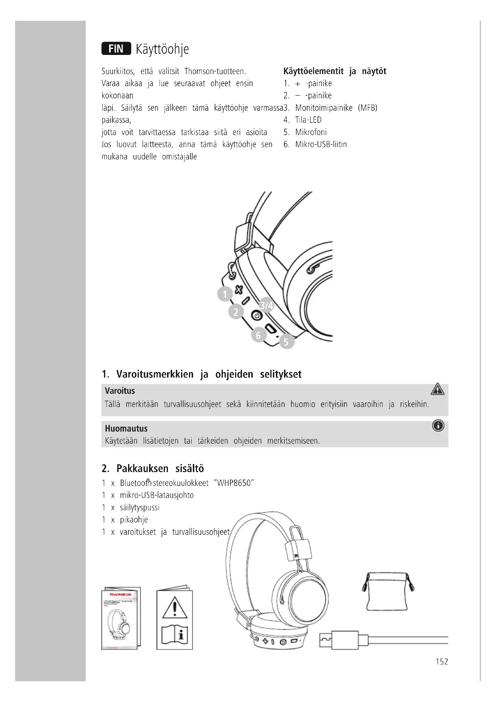 -stereokuulokkeet ”WHP8650” 1 x mikro-USB-latausjohto 1 x säilytyspussi 1 x pikaohje 1 x varoitukset ja turvallisuusohjeet L Käyttöohje