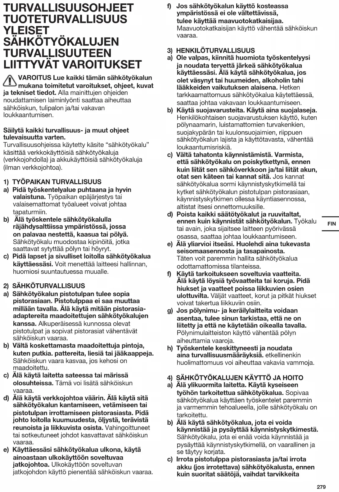 VAROITUS Lue kaikki tämän sähkötyökalun mukana toimitetut varoitukset, ohjeet, kuvat ja tekniset tiedot. Alla mainittujen ohjeiden noudattamisen laiminlyönti saattaa aiheuttaa sähköiskun, tulipalon ja/tai vakavan loukkaantumisen. Säilytä kaikki turvallisuus- ja muut ohjeet tulevaisuutta varten. Turvallisuusohjeissa käytetty käsite “sähkötyökalu” käsittää verkkokäyttöisiä sähkötyökaluja (verkkojohdolla) ja akkukäyttöisiä sähkötyökaluja (ilman verkkojohtoa).