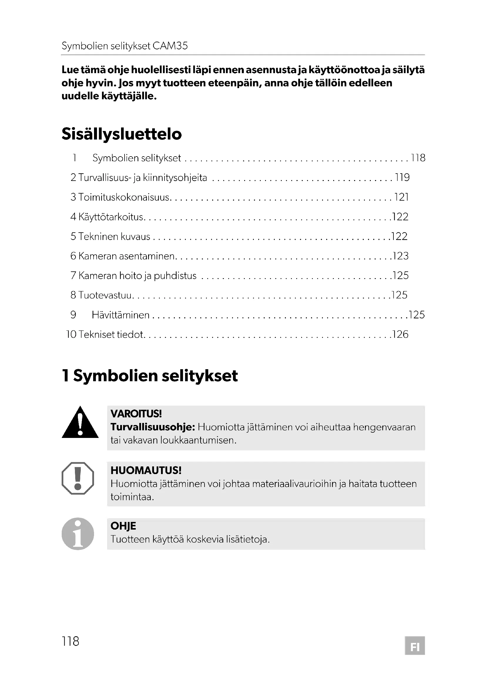 - Lue tämä ohje huolellisesti läpi ennen asennusta ja käyttöönottoa ja säilytä ohje hyvin. Jos myyt tuotteen eteenpäin, anna ohje tällöin edelleen uudelle käyttäjälle. Sisällysluettelo 1 Symbolien selitykset p. 118