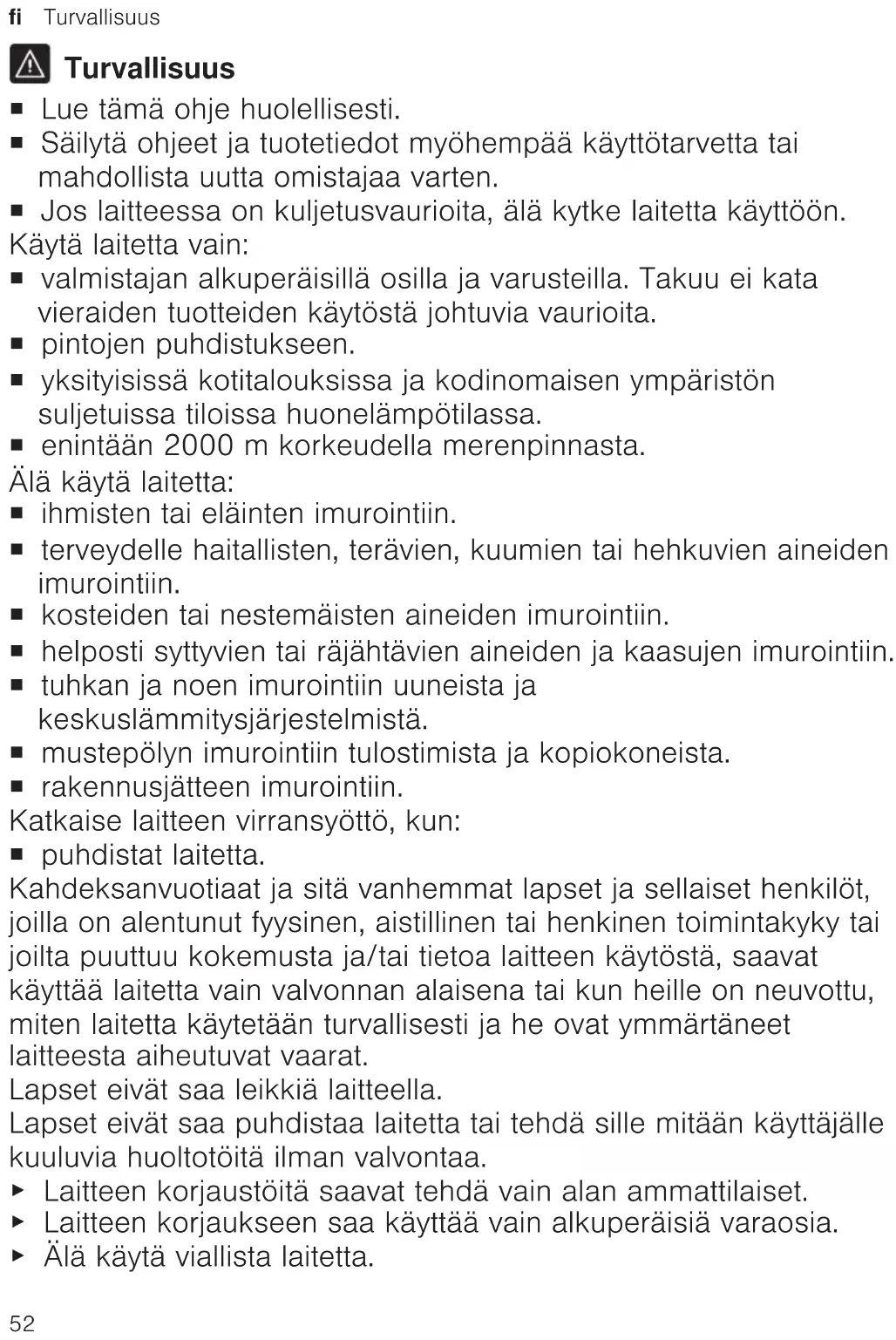 Turvallisuus ¡ Lue tämä ohje huolellisesti. ¡ Säilytä ohjeet ja tuotetiedot myöhempää käyttötarvetta tai mahdollista uutta omistajaa varten. ¡ Jos laitteessa on kuljetusvaurioita, älä kytke laitetta käyttöön. Käytä laitetta vain: ¡ valmistajan alkuperäisillä osilla ja varusteilla. Takuu ei kata vieraiden tuotteiden käytöstä johtuvia vaurioita. ¡ pintojen puhdistukseen. ¡ yksityisissä kotitalouksissa ja kodinomaisen ympäristön suljetuissa tiloissa huonelämpötilassa. ¡ enintään 2000m korkeudella merenpinnasta. Älä käytä laitetta: ¡ ihmisten tai eläinten imurointiin. ¡ terveydelle haitallisten, terävien, kuumien tai hehkuvien aineiden imurointiin. ¡ kosteiden tai nestemäisten aineiden imurointiin. ¡ helposti syttyvien tai räjähtävien aineiden ja kaasujen imurointiin. ¡ tuhkan ja noen imurointiin uuneista ja keskuslämmitysjärjestelmistä. ¡ mustepölyn imurointiin tulostimista ja kopiokoneista. ¡ rakennusjätteen imurointiin. Katkaise laitteen virransyöttö, kun: ¡ puhdistat laitetta. Kahdeksanvuotiaat ja sitä vanhemmat lapset ja sellaiset henkilöt, joilla on alentunut fyysinen, aistillinen tai henkinen toimintakyky tai joilta puuttuu kokemusta ja/tai tietoa laitteen käytöstä, saavat käyttää laitetta vain valvonnan alaisena tai kun heille on neuvottu, miten laitetta käytetään turvallisesti ja he ovat ymmärtäneet laitteesta aiheutuvat vaarat. Lapset eivät saa leikkiä laitteella. Lapset eivät saa puhdistaa laitetta tai tehdä sille mitään käyttäjälle kuuluvia huoltotöitä ilman valvontaa. ▶ Laitteen korjaustöitä saavat tehdä vain alan ammattilaiset. ▶ Laitteen korjaukseen saa käyttää vain alkuperäisiä varaosia. ▶ Älä käytä viallista laitetta.Turvallisuus fi