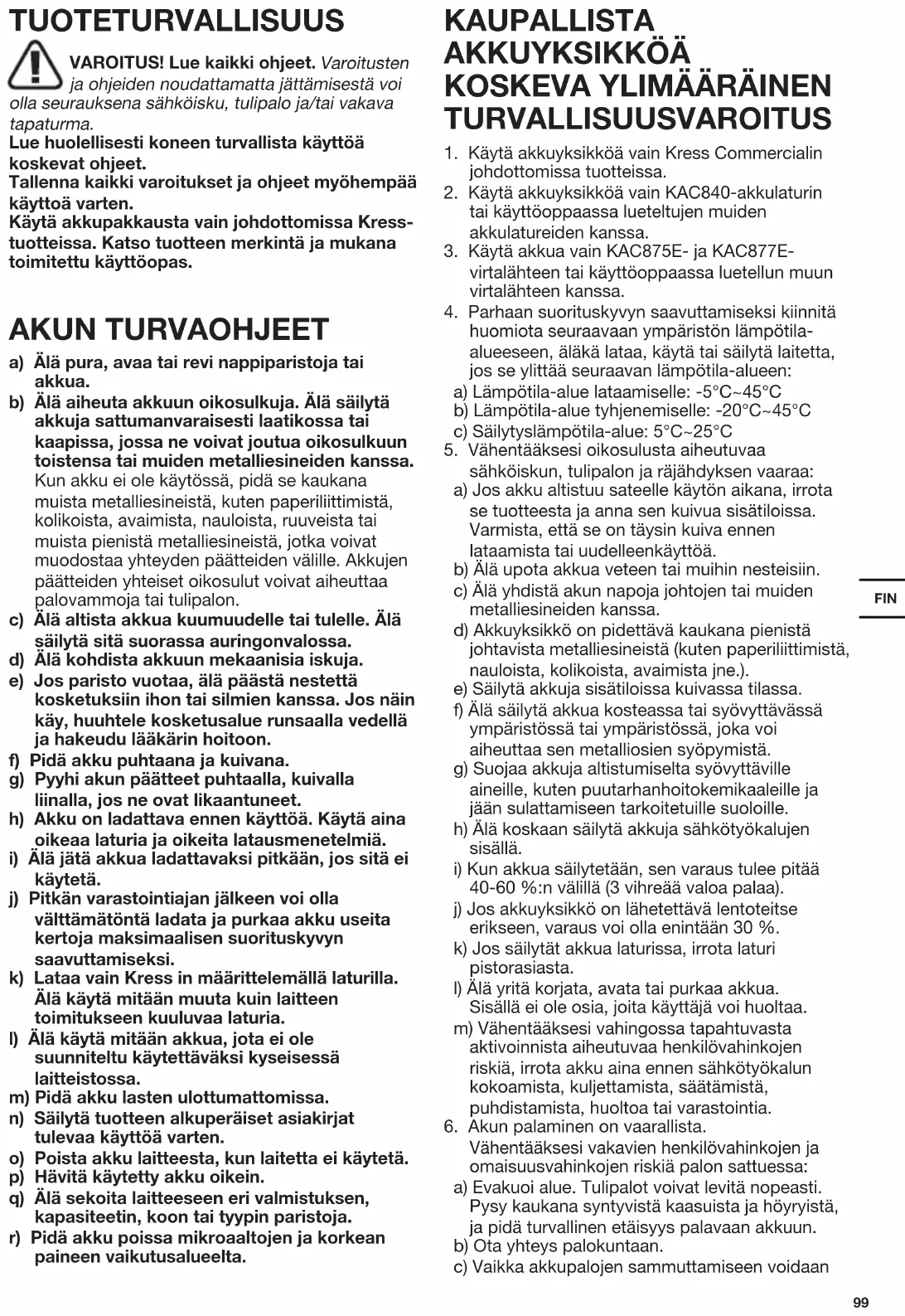 TUOTETURVALLISUUS VAROITUS! Lue kaikki ohjeet. Varoitusten ja ohjeiden noudattamatta jättämisestä voi olla seurauksena sähköisku, tulipalo ja/tai vakava tapaturma. Lue huolellisesti koneen turvallista käyttöä koskevat ohjeet. Tallenna kaikki varoitukset ja ohjeet myöhempää käyttoä varten. Käytä akkupakkausta vain johdottomissa Kress- tuotteissa. Katso tuotteen merkintä ja mukana toimitettu käyttöopas. AKUN TURVAOHJEET a) Älä pura, avaa tai revi nappiparistoja tai akkua. b) Älä aiheuta akkuun oikosulkuja. Älä säilytä akkuja sattumanvaraisesti laatikossa tai kaapissa, jossa ne voivat joutua oikosulkuun toistensa tai muiden metalliesineiden kanssa. Kun akku ei ole käytössä, pidä se kaukana muista metalliesineistä, kuten paperiliittimistä, kolikoista, avaimista, nauloista, ruuveista tai muista pienistä metalliesineistä, jotka voivat muodostaa yhteyden päätteiden välille. Akkujen päätteiden yhteiset oikosulut voivat aiheuttaa palovammoja tai tulipalon. c) Älä altista akkua kuumuudelle tai tulelle. Älä säilytä sitä suorassa auringonvalossa. d) Älä kohdista akkuun mekaanisia iskuja. e) Jos paristo vuotaa, älä päästä nestettä kosketuksiin ihon tai silmien kanssa. Jos näin käy, huuhtele kosketusalue runsaalla vedellä ja hakeudu lääkärin hoitoon. f) Pidä akku puhtaana ja kuivana. g) Pyyhi akun päätteet puhtaalla, kuivalla liinalla, jos ne ovat likaantuneet. h) Akku on ladattava ennen käyttöä. Käytä aina oikeaa laturia ja oikeita latausmenetelmiä.