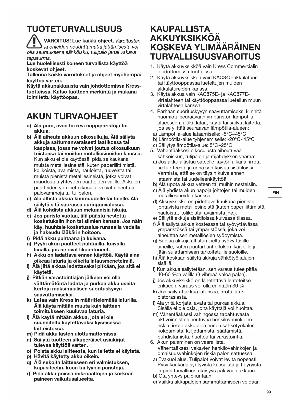 TUOTETURVALLISUUS VAROITUS! Lue kaikki ohjeet. Varoitusten ja ohjeiden noudattamatta jättämisestä voi olla seurauksena sähköisku, tulipalo ja/tai vakava tapaturma. Lue huolellisesti koneen turvallista käyttöä koskevat ohjeet. Tallenna kaikki varoitukset ja ohjeet myöhempää käyttoä varten. Käytä akkupakkausta vain johdottomissa Kress- tuotteissa. Katso tuotteen merkintä ja mukana toimitettu käyttöopas. AKUN TURVAOHJEET a) Älä pura, avaa tai revi nappiparistoja tai akkua. b) Älä aiheuta akkuun oikosulkuja. Älä säilytä akkuja sattumanvaraisesti laatikossa tai kaapissa, jossa ne voivat joutua oikosulkuun toistensa tai muiden metalliesineiden kanssa. Kun akku ei ole käytössä, pidä se kaukana muista metalliesineistä, kuten paperiliittimistä, kolikoista, avaimista, nauloista, ruuveista tai muista pienistä metalliesineistä, jotka voivat muodostaa yhteyden päätteiden välille. Akkujen päätteiden yhteiset oikosulut voivat aiheuttaa palovammoja tai tulipalon. c) Älä altista akkua kuumuudelle tai tulelle. Älä säilytä sitä suorassa auringonvalossa. d) Älä kohdista akkuun mekaanisia iskuja. e) Jos paristo vuotaa, älä päästä nestettä kosketuksiin ihon tai silmien kanssa. Jos näin käy, huuhtele kosketusalue runsaalla vedellä ja hakeudu lääkärin hoitoon. f) Pidä akku puhtaana ja kuivana. g) Pyyhi akun päätteet puhtaalla, kuivalla liinalla, jos ne ovat likaantuneet. h) Akku on ladattava ennen käyttöä. Käytä aina oikeaa laturia ja oikeita latausmenetelmiä.