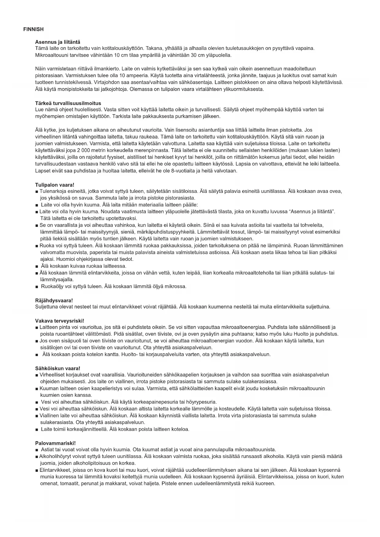 Hvis du trenger en fullstendig samsvarserklæring, kan du kontakte adressen som står på baksiden av denne håndboken.FINNISH Asennus ja liitäntä Tämä laite on tarkoitettu vain kotitalouskäyttöön. Takana, ylhäällä ja alhaalla olevien tuuletusaukkojen on pysyttävä vapaina. Mikroaaltouuni tarvitsee vähintään 10 cm tilaa ympärillä ja vähintään 30 cm yläpuolella. Näin varmistetaan riittävä ilmankierto. Laite on valmis kytkettäväksi ja sen saa kytkeä vain oikein asennettuun maadoitettuun pistorasiaan. Varmistuksen tulee olla 10 ampeeria. Käytä tuotetta aina virtalähteestä, jonka jännite, taajuus ja luokitus ovat samat kuin tuotteen tunnistekilvessä. Virtajohdon saa asentaa/vaihtaa vain sähköasentaja. Laitteen pistokkeen on aina oltava helposti käytettävissä. Älä käytä monipistokkeita tai jatkojohtoja. Olemassa on tulipalon vaara virtalähteen ylikuormituksesta. Tärkeä turvallisuusilmoitus Lue nämä ohjeet huolellisesti. Vasta sitten voit käyttää laitetta oikein ja turvallisesti. Säilytä ohjeet myöhempää käyttöä varten tai myöhempien omistajien käyttöön. Tarkista laite pakkauksesta purkamisen jälkeen. Älä kytke, jos kuljetuksen aikana on aiheutunut vaurioita. Vain lisensoitu asiantuntija saa liittää laitteita ilman pistoketta. Jos virheellinen liitäntä vahingoittaa laitetta, takuu raukeaa. Tämä laite on tarkoitettu vain kotitalouskäyttöön. Käytä sitä vain ruoan ja juomien valmistukseen. Varmista, että laitetta käytetään valvottuna. Laitetta saa käyttää vain suljetuissa tiloissa. Laite on tarkoitettu käytettäväksi jopa 2 000 metrin korkeudella merenpinnasta. Tätä laitetta ei ole suunniteltu sellaisten henkilöiden (mukaan lukien lasten) käytettäväksi, joilla on rajoitetut fyysiset, aistilliset tai henkiset kyvyt tai henkilöt, joilla on riittämätön kokemus ja/tai tiedot, ellei heidän turvallisuudestaan vastaava henkilö valvo sitä tai ellei he ole opastettu laitteen käytössä. Lapsia on valvottava, etteivät he leiki laitteella. Lapset eivät saa puhdistaa ja huoltaa laitetta, elleivät he ole 8-vuotiaita ja heitä valvotaan. Tulipalon vaara! ■ Tulenarkoja esineitä, jotka voivat syttyä tuleen, säilytetään sisätiloissa. Älä säilytä palavia esineitä uunitilassa. Älä koskaan avaa ovea, jos yksikössä on savua. Sammuta laite ja irrota pistoke pistorasiasta. ■ Laite voi olla hyvin kuuma. Älä laita mitään materiaalia laitteen päälle: ■ Laite voi olla hyvin kuuma. Noudata vaatimusta laitteen yläpuolelle jätettävästä tilasta, joka on kuvattu luvussa “Asennus ja liitäntä”. Tätä laitetta ei ole tarkoitettu upotettavaksi. ■ Se on vaarallista ja voi aiheuttaa vahinkoa, kun laitetta ei käytetä oikein. Siinä ei saa kuivata astioita tai vaatteita tai tohveleita, lämmittää lämpö- tai maissityynyjä, sieniä, märkäpuhdistuspyyhkeitä. Lämmitettävät tossut, lämpö- tai maissityynyt voivat esimerkiksi pitää liekkiä sisällään myös tuntien jälkeen. Käytä laitetta vain ruoan ja juomien valmistukseen. ■ Ruoka voi syttyä tuleen. Älä koskaan lämmitä ruokaa pakkauksissa, joiden tarkoituksena on pitää ne lämpiminä. Ruoan lämmittäminen valvomatta muovista, paperista tai muista palavista aineista valmistetuissa astioissa. Älä koskaan aseta liikaa tehoa tai liian pitkäksi ajaksi. Huomioi ohjekirjassa olevat tiedot. ■ Älä koskaan kuivaa ruokaa laitteessa. ■ Älä koskaan lämmitä elintarvikkeita, joissa on vähän vettä, kuten leipää, liian korkealla mikroaaltoteholla tai liian pitkällä sulatus- tai lämmitysajalla. ■ Ruokaöljy voi syttyä tuleen. Älä koskaan lämmitä öljyä mikrossa. Räjähdysvaara! Suljettuna olevat nesteet tai muut elintarvikkeet voivat räjähtää. Älä koskaan kuumenna nesteitä tai muita elintarvikkeita suljettuina. Vakava terveysriski! ■ Laitteen pinta voi vaurioitua, jos sitä ei puhdisteta oikein. Se voi sitten vapauttaa mikroaaltoenergiaa. Puhdista laite säännöllisesti ja poista ruoantähteet välittömästi. Pidä sisätilat, oven tiiviste, ovi ja oven pysäytin aina puhtaana; katso myös luku Huolto ja puhdistus. ■ Jos oven sisäpuoli tai oven tiiviste on vaurioitunut, se voi aiheuttaa mikroaaltoenergian vuodon. Älä koskaan käytä laitetta, kun sisätilojen ovi tai oven tiiviste on vaurioitunut. Ota yhteyttä asiakaspalveluun. ■ Älä koskaan poista kotelon kantta. Huolto- tai korjauspalveluita varten, ota yhteyttä asiakaspalveluun. Sähköiskun vaara! ■ Virheelliset korjaukset ovat vaarallisia. Vaurioituneiden sähkökaapelien korjauksen ja vaihdon saa suorittaa vain asiakaspalvelun ohjeiden mukaisesti. Jos laite on viallinen, irrota pistoke pistorasiasta tai sammuta sulake sulakerasiassa. ■ Kuuman laitteen osien kaapelieristys voi sulaa. Varmista, että sähkölaitteiden kaapelit eivät joudu kosketuksiin mikroaaltouunin kuumien osien kanssa. ■ Vesi voi aiheuttaa sähköiskun. Älä käytä korkeapainepesuria tai höyrypesuria. ■ Vesi voi aiheuttaa sähköiskun. Älä koskaan altista laitetta korkealle lämmölle ja kosteudelle. Käytä laitetta vain suljetuissa tiloissa. ■ Viallinen laite voi aiheuttaa sähköiskun. Älä koskaan käynnistä viallista laitetta. Irrota virta pistorasiasta tai sammuta sulake sulakerasiasta. Ota yhteyttä asiakaspalveluun. ■ Laite toimii korkeajännitteellä. Älä koskaan poista laitteen koteloa. Palovammariski! ■ Astiat tai vuoat voivat olla hyvin kuumia. Ota kuumat astiat ja vuoat aina pannulapulla mikroaaltouunista. ■ Alkoholihöyryt voivat syttyä tuleen uunitilassa. Älä koskaan valmista ruokaa, joka sisältää runsaasti alkoholia. Käytä vain pieniä määriä juomia, joiden alkoholipitoisuus on korkea. ■ Elintarvikkeet, joissa on kova kuori tai muu kuori, voivat räjähtää uudelleenlämmityksen aikana tai sen jälkeen. Älä koskaan kypsennä munia kuoressa tai lämmitä kovaksi keitettyjä munia uudelleen. Älä koskaan k