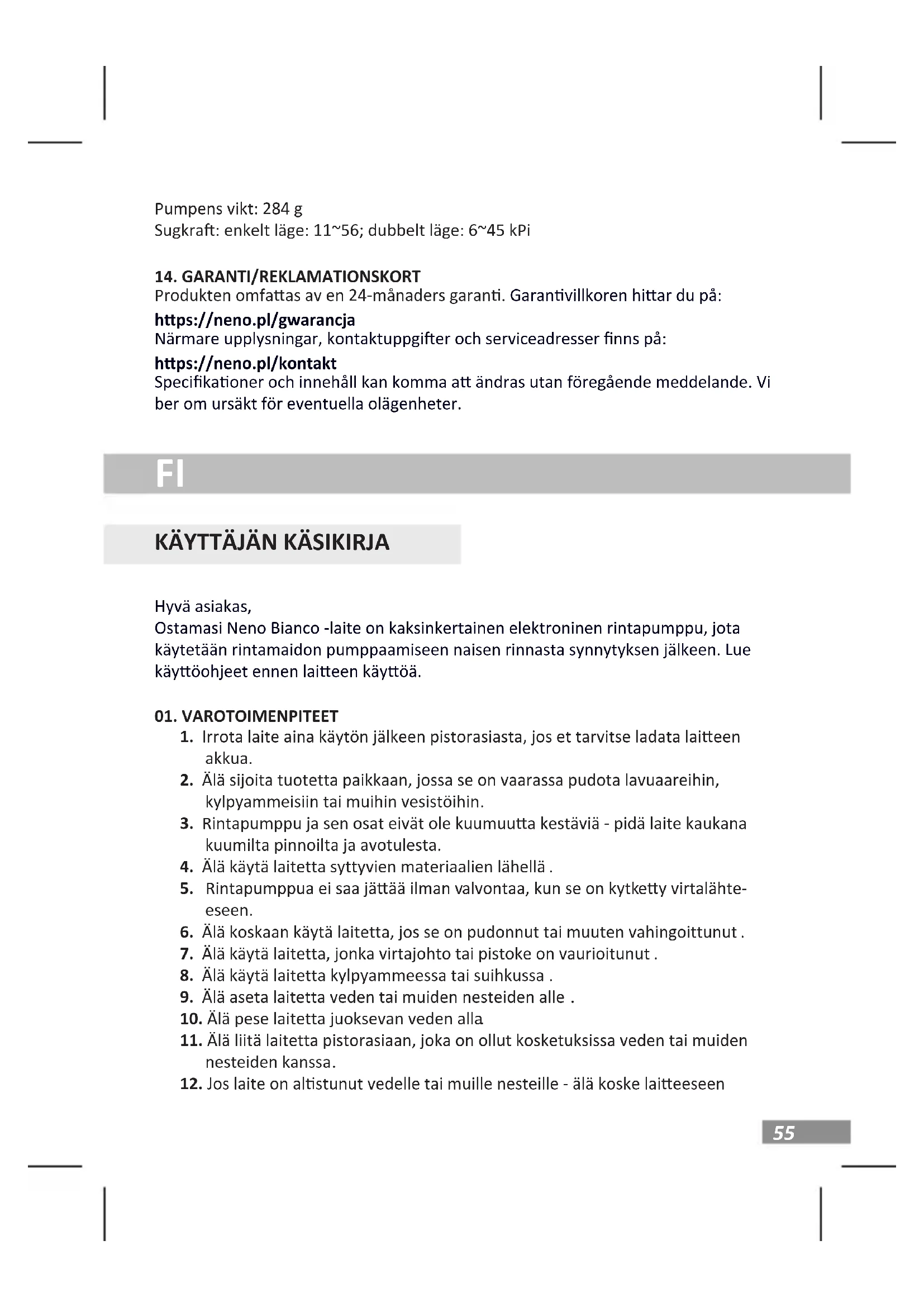Tuoeella on 24 kuukauden takuu. Takuuehdot löytyvät osoieesta: hps://neno.pl/gwarancja. Yksityiskohdat, yhteysedot ja palveluosoite löytyvät osoieesta: hps://neno.pl/kontakt. Tekniset edot ja sisältö voivat muuua ilman ennakkoilmoitusta. Pahoielemme mahdollisia häiriöitä.62