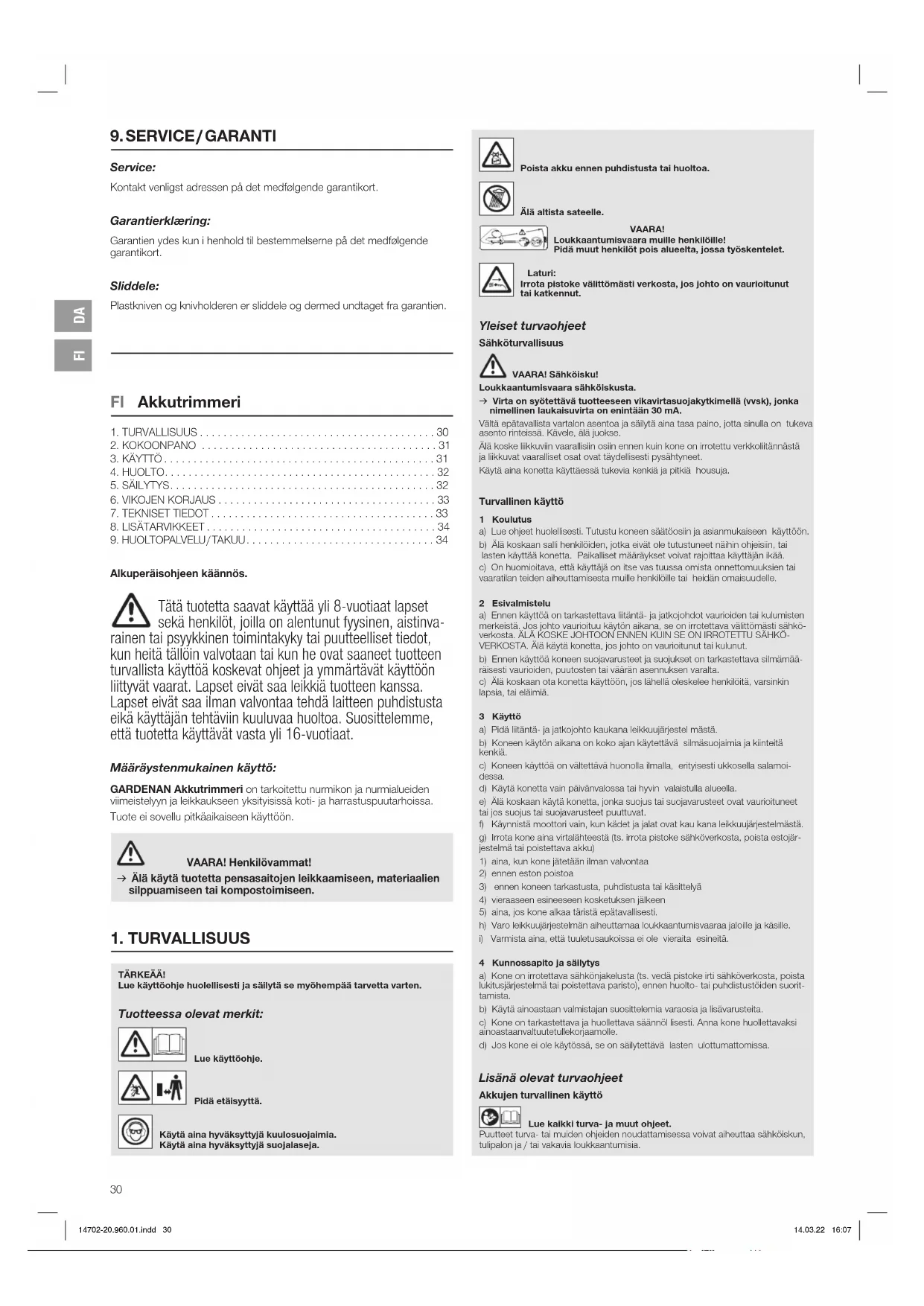 Service: Kontakt venligst adressen på det medfølgende garantikort. Garantierklæring: Garantien ydes kun i henhold til bestemmelserne på det medfølgende garantikort. Sliddele: Plastkniven og knivholderen er sliddele og dermed undtaget fra garantien. Poista akku ennen puhdistusta tai huoltoa. Älä altista sateelle. VAARA! Loukkaantumisvaara muille henkilöille! Pidä muut henkilöt pois alueelta, jossa työskentelet. Laturi: Irrota pistoke välittömästi verkosta, jos johto on vaurioitunut tai katkennut. Yleiset turvaohjeet Sähköturvallisuus VAARA! Sähköisku!Loukkaantumisvaara sähköiskusta.v Virta on syötettävä tuotteeseen vikavirtasuojakytkimellä (vvsk), jonka nimellinen laukaisuvirta on enintään 30 mA.Vältä epätavallista vartalon asentoa ja säilytä aina tasa paino, jotta sinulla on tukeva asento rinteissä. Kävele, älä juokse.Älä koske liikkuviin vaarallisiin osiin ennen kuin kone on irrotettu verkkoliitännästä ja liikkuvat vaaralliset osat ovat täydellisesti pysähtyneet.Käytä aina konetta käyttäessä tukevia kenkiä ja pitkiä housuja. Turvallinen käyttö 1 Koulutusa) Lue ohjeet huolellisesti. Tutustu koneen säätöosiin ja asianmukaiseen käyttöön.b) Älä koskaan salli henkilöiden, jotka eivät ole tutustuneet näihin ohjeisiin, tai lasten käyttää konetta. Paikalliset määräykset voivat rajoittaa käyttäjän ikää.c) On huomioitava, että käyttäjä on itse vas tuussa omista onnettomuuksien tai vaaratilan teiden aiheuttamisesta muille henkilöille tai heidän omaisuudelle.2 Esivalmistelua) Ennen käyttöä on tarkastettava liitäntä- ja jatkojohdot vaurioiden tai kulumisten merkeistä. Jos johto vaurioituu käytön aikana, se on irrotettava välittömästi sähkö-verkosta. ÄLÄ KOSKE JOHTOON ENNEN KUIN SE ON IRROTETTU SÄHKÖ-VERKOSTA. Älä käytä konetta, jos johto on vaurioitunut tai kulunut.b) Ennen käyttöä koneen suojavarusteet ja suojukset on tarkastettava silmämää-räisesti vaurioiden, puutosten tai väärän asennuksen varalta.c) Älä koskaan ota konetta käyttöön, jos lähellä oleskelee henkilöitä, varsinkin lapsia, tai eläimiä.3 Käyttöa) Pidä liitäntä- ja jatkojohto kaukana leikkuujärjestel mästä.b) Koneen käytön aikana on koko ajan käytettävä silmäsuojaimia ja kiinteitä kenkiä.c) Koneen käyttöä on vältettävä huonolla ilmalla, erityisesti ukkosella salamoi-dessa.d) Käytä konetta vain päivänvalossa tai hyvin valaistulla alueella.e) Älä koskaan käytä konetta, jonka suojus tai suojavarusteet ovat vaurioituneet tai jos suojus tai suojavarusteet puuttuvat.f) Käynnistä moottori vain, kun kädet ja jalat ovat kau kana leikkuujärjestelmästä.g) Irrota kone aina virtalähteestä (ts. irrota pistoke sähköverkosta, poista estojär-jestelmä tai poistettava akku)1) aina, kun kone jätetään ilman valvontaa2) ennen eston poistoa3) ennen koneen tarkastusta, puhdistusta tai käsittelyä4) vieraaseen esineeseen kosketuksen jälkeen5) aina, jos kone alkaa täristä epätavallisesti.h) Varo leikkuujärjestelmän aiheuttamaa loukkaantumisvaaraa jaloille ja käsille.i) Varmista aina, että tuuletusaukoissa ei ole vieraita esineitä.4 Kunnossapito ja säilytysa) Kone on irrotettava sähkönjakelusta (ts. vedä pistoke irti sähköverkosta, poista lukitusjärjestelmä tai poistettava paristo), ennen huolto- tai puhdistustöiden suorit-tamista.b) Käytä ainoastaan valmistajan suosittelemia varaosia ja lisävarusteita.c) Kone on tarkastettava ja huollettava säännöl lisesti. Anna kone huollettavaksi ainoastaan valtuutetulle korjaamolle.d) Jos kone ei ole käytössä, se on säilytettävä lasten ulottumattomissa. Lisänä olevat turvaohjeet Akkujen turvallinen käyttö Lue kaikki turva- ja muut ohjeet.Puutteet turva- tai muiden ohjeiden noudattamisessa voivat aiheuttaa sähköiskun, tulipalon ja / tai vakavia loukkaantumisia.