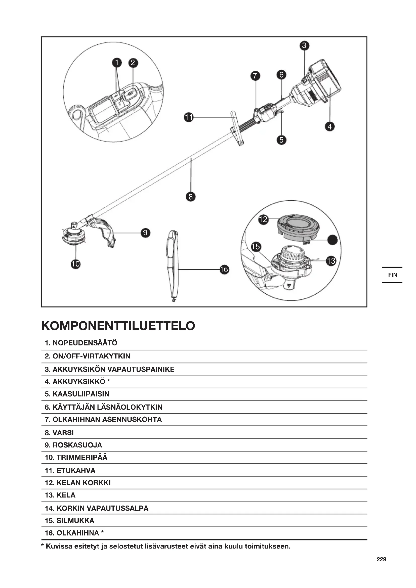 a) Anna koulutettujen ammattihenkilöiden korjata sähkötyökalusi ja hyväksy korjauksiin vain alkuperäisiä varaosia. Täten varmistat, että sähkötyökalu säilyy turvallisena. b) Älä missään tapauksessa yritä itse korjata vaurioituneita akkuja. Akkuja saa korjata vain valmistaja tai valtuutettu huoltopiste. PENSASLEIKKURIN JA PENSASSAHAN TURVALLISUUSVAROITUKSET a) Vältä koneen käyttöä huonoissa sääolosuhteissa ja varsinkin salamaniskun vaaran aikana. Tämä vähentää salamaniskun riskiä. b) Tarkasta perusteellisesti alue, jossa konetta aiotaan käyttää, villieläinten varalta. Kone voi vahingoittaa villieläimiä käytön aikana. c) Tarkasta perusteellisesti alue, jossa konetta aiotaan käyttää, ja poista kaikki kivet, tikut, johdot, luut ja muut vieraat esineet käytön tieltä. Lentävät esineet voivat aiheuttaa henkilövahinkoja. d) Ennen koneen käyttöä on aina tarkastettava silmämääräisesti, että leikkuri tai terä tai leikkuri- tai teräkokoonpano eivät ole vaurioituneet. Vaurioituneet osat lisäävät loukkaantumisriskiä. e) Noudata lisävarusteiden vaihtamista koskevia ohjeita. Väärin kiristetyt terän kiinnitysmutterit tai -pultit voivat joko vahingoittaa terää tai johtaa sen irtoamiseen. f) Terän nimellispyörimisnopeuden on oltava vähintään yhtä suuri kuin koneeseen merkitty enimmäispyörimisnopeus.232 FIN Nimellispyörimisnopeuttaan nopeammin pyörivät terät voivat rikkoutua ja lentää koneesta. g) Käytä silmien, korvien, pään ja käsien suojaimia. Asianmukaiset suojavarusteet vähentävät lentävien roskien aiheuttamia henkilövahinkoja tai vahingossa tapahtuvaa kosketusta leikkaussiiman tai terän kanssa. h) Käytä koneen käytön aikana aina turvajalkineita. Älä käytä konetta paljain jaloin tai avoimissa sandaaleissa. Tämä vähentää jalkojen loukkaantumisen mahdollisuutta kosketuksesta liikkuvaan leikkuriin, siimaan tai terään.