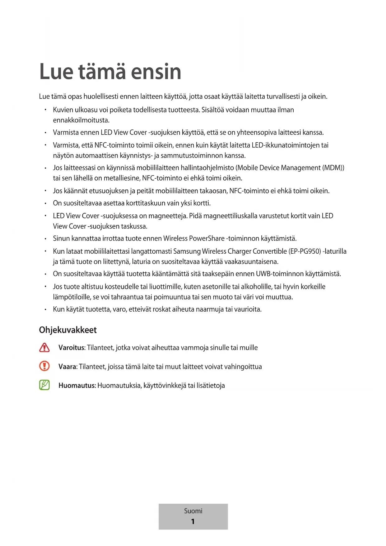 Kun käytät tuotetta, varo, etteivät roskat aiheuta naarmuja tai vaurioita. Ohjekuvakkeet Varoitus: Tilanteet, jotka voivat aiheuttaa vammoja sinulle tai muille Vaara: Tilanteet, joissa tämä laite tai muut laitteet voivat vahingoittua Huomautus: Huomautuksia, käyttövinkkejä tai lisätietoja Suomi