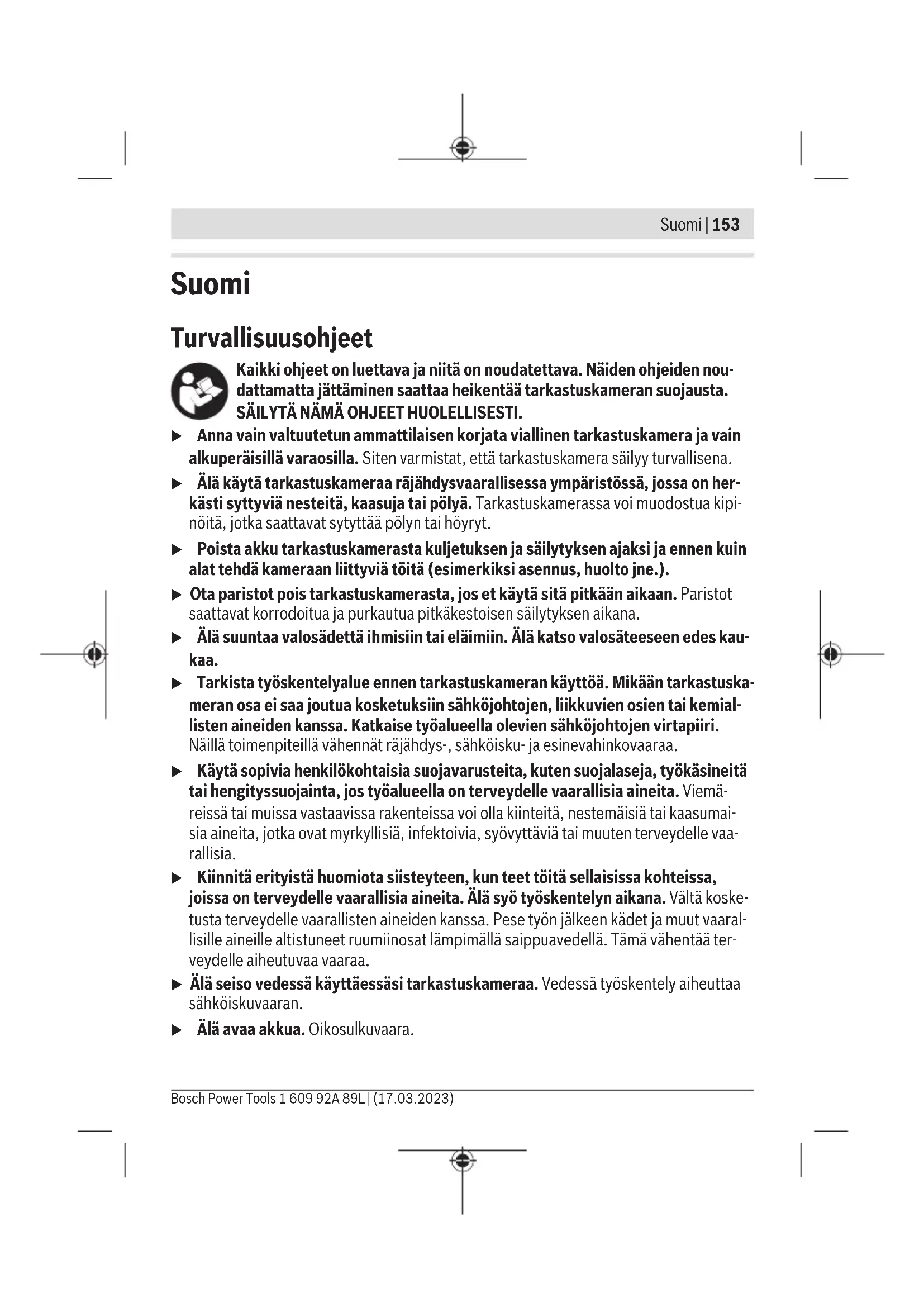 (rød advarsel) Micro-SD-kort fullt Slett filer fra Micro-SD-kortet(20). Feil på Micro-SD- kortet Ta ut Micro-SD-kortet(20), og sett det inn på nytt. 1 609 92A 89L | (17.03.2023) Bosch Power ToolsNorsk | 151 Feilvisning på displayet Årsak Løsning Kontroller Micro-SD-kortet ved å sette det inn i en annen enhet. Service og vedlikehold Vedlikehold og rengjøring Ikke senk den håndholdte enheten(13) ned i vann eller andre væsker. Sørg for at inspeksjonskameraet alltid er rent. Rengjør inspeksjonskameraet og alle hjelpemidlene spesielt grundig etter at du har arbeidet på steder med helsefarlige stoffer. Tørk bort skitt med en myk, fuktig klut. Bruk ikke rengjørings- eller løsemidler. Rengjør spesielt kameralinsen(4) regelmessig, og pass på å unngå lo. Skifte ut det integrerte knappcellebatteriet Knappcellebatteriet må skiftes ut av Bosch eller et autorisert serviceverksted for Bosch elektroverktøy. u Obs! Et knappcellebatteri må alltid skiftes ut med et knappcellebatteri av samme type. Det er fare for eksplosjon. u Utladede knappcellebatterier må tas ut og kastes forskriftsmessig. Utladede knappcellebatterier kan bli utette og dermed skade produktet eller personer. Kundeservice og kundeveiledning Kundeservice hjelper deg ved spørsmål om reparasjon og vedlikehold av produktet ditt og reservedelene. Du finner også sprengskisser og informasjon om reservedeler på www.bosch-pt.com Boschs kundeveilederteam hjelper deg gjerne hvis du har spørsmål om våre produkter og tilbehør. Ved alle forespørsler og reservedelsbestillinger må du oppgi det 10‑sifrede produktnummeret som er angitt på produktets typeskilt. Norsk Robert Bosch AS Postboks 350 1402 Ski Tel.: 64 87 89 50 Faks: 64 87 89 55 Bosch Power Tools 1 609 92A 89L | (17.03.2023)152 | Norsk Du finner adresser til andre verksteder på: www.bosch-pt.com/serviceaddresses Transport De anbefalte li-ion-batteriene underligger kravene for farlig gods. Batteriene kan transporteres på veier av brukeren uten ytterligere krav. Ved forsendelse gjennom tredje personer (f.eks.: lufttransport eller spedisjon) må det oppfylles spesielle krav til emballasje og merking. Du må konsultere en ekspert for farlig gods ved forberedelse av forsendelsen. Send batterier kun hvis huset ikke er skadet. Lim igjen de åpne kontaktene og pakk batteriet slik at det ikke beveger seg i emballasjen. Ta også hensyn til videreførende nasjonale forskrifter. Kassering Inspeksjonskamera, oppladbare batterier og engangsbatterier, tilbehør og emballasje skal leveres til gjenvinning. Ikke kast inspeksjonskameraet og engangsbatteriene / de oppladbare batteriene i husholdningsavfallet! Bare for land i EU: Ifølge det europeiske direktivet 2012/19/EU skal inspeksjonskameraer som ikke lenger kan brukes, og ifølge det europeiske direktivet 2006/66/EC skal defekte eller brukte oppladbare batterier / engangsbatterier, sorteres og gjenvinnes. Ikke-forskriftsmessig håndtering av elektrisk og elektronisk avfall kan føre til miljø- og helseskader på grunn av eventuelle farlige stoffer. (Oppladbare) batterier: Li-ion: Se informasjonen i avsnittet Transport (se „Transport“, Side152). Det integrerte knappcellebatteriet må kun tas ut og kasseres av fagfolk. 1 609 92A 89L | (17.03.2023) Bosch Power ToolsSuomi | 153 Suomi Turvallisuusohjeet Kaikki ohjeet on luettava ja niitä on noudatettava. Näiden ohjeiden nou- dattamatta jättäminen saattaa heikentää tarkastuskameran suojausta. SÄILYTÄ NÄMÄ OHJEET HUOLELLISESTI. u Anna vain valtuutetun ammattilaisen korjata viallinen tarkastuskamera ja vain alkuperäisillä varaosilla. Siten varmistat, että tarkastuskamera säilyy turvallisena. u Älä käytä tarkastuskameraa räjähdysvaarallisessa ympäristössä, jossa on her- kästi syttyviä nesteitä, kaasuja tai pölyä. Tarkastuskamerassa voi muodostua kipi- nöitä, jotka saattavat sytyttää pölyn tai höyryt. u Poista akku tarkastuskamerasta kuljetuksen ja säilytyksen ajaksi ja ennen kuin alat tehdä kameraan liittyviä töitä (esimerkiksi asennus, huolto jne.). u Ota paristot pois tarkastuskamerasta, jos et käytä sitä pitkään aikaan. Paristot saattavat korrodoitua ja purkautua pitkäkestoisen säilytyksen aikana. u Älä suuntaa valosädettä ihmisiin tai eläimiin. Älä katso valosäteeseen edes kau- kaa. u Tarkista työskentelyalue ennen tarkastuskameran käyttöä. Mikään tarkastuska- meran osa ei saa joutua kosketuksiin sähköjohtojen, liikkuvien osien tai kemial- listen aineiden kanssa. Katkaise työalueella olevien sähköjohtojen virtapiiri. Näillä toimenpiteillä vähennät räjähdys-, sähköisku- ja esinevahinkovaaraa. u Käytä sopivia henkilökohtaisia suojavarusteita, kuten suojalaseja, työkäsineitä tai hengityssuojainta, jos työalueella on terveydelle vaarallisia aineita. Viemä- reissä tai muissa vastaavissa rakenteissa voi olla kiinteitä, nestemäisiä tai kaasumai- sia aineita, jotka ovat myrkyllisiä, infektoivia, syövyttäviä tai muuten terveydelle vaa- rallisia. u Kiinnitä erityistä huomiota siisteyteen, kun teet töitä sellaisissa kohteissa, joissa on terveydelle vaarallisia aineita. Älä syö työskentelyn aikana. Vältä koske- tusta terveydelle vaarallisten aineiden kanssa. Pese työn jälkeen kädet ja muut vaaral- lisille aineille altistuneet ruumiinosat lämpimällä saippuavedellä. Tämä vähentää ter- veydelle aiheutuvaa vaaraa. u Älä seiso vedessä käyttäessäsi tarkastuskameraa. Vedessä työskentely aiheuttaa sähköiskuvaaran. u Älä avaa akkua. Oikosulkuvaara. Bosch Power Tools 1 609 92A 89L | (17.03.2023)154 | Suomi u Akusta saattaa purkautua höyryä, jos akku vioittuu tai jos akkua käytetään epä- asianmukaisesti. Akku saattaa syttyä palamaan tai räjähtää. Järjestä tehokas il- manvaihto ja käänny lääkärin puoleen, jos havaitset ärsytystä. Höyry voi ärsyttää hen- gitysteitä. u Virheellisen käytön tai vaurioituneen akun yhteydessä akusta saattaa vuotaa herk