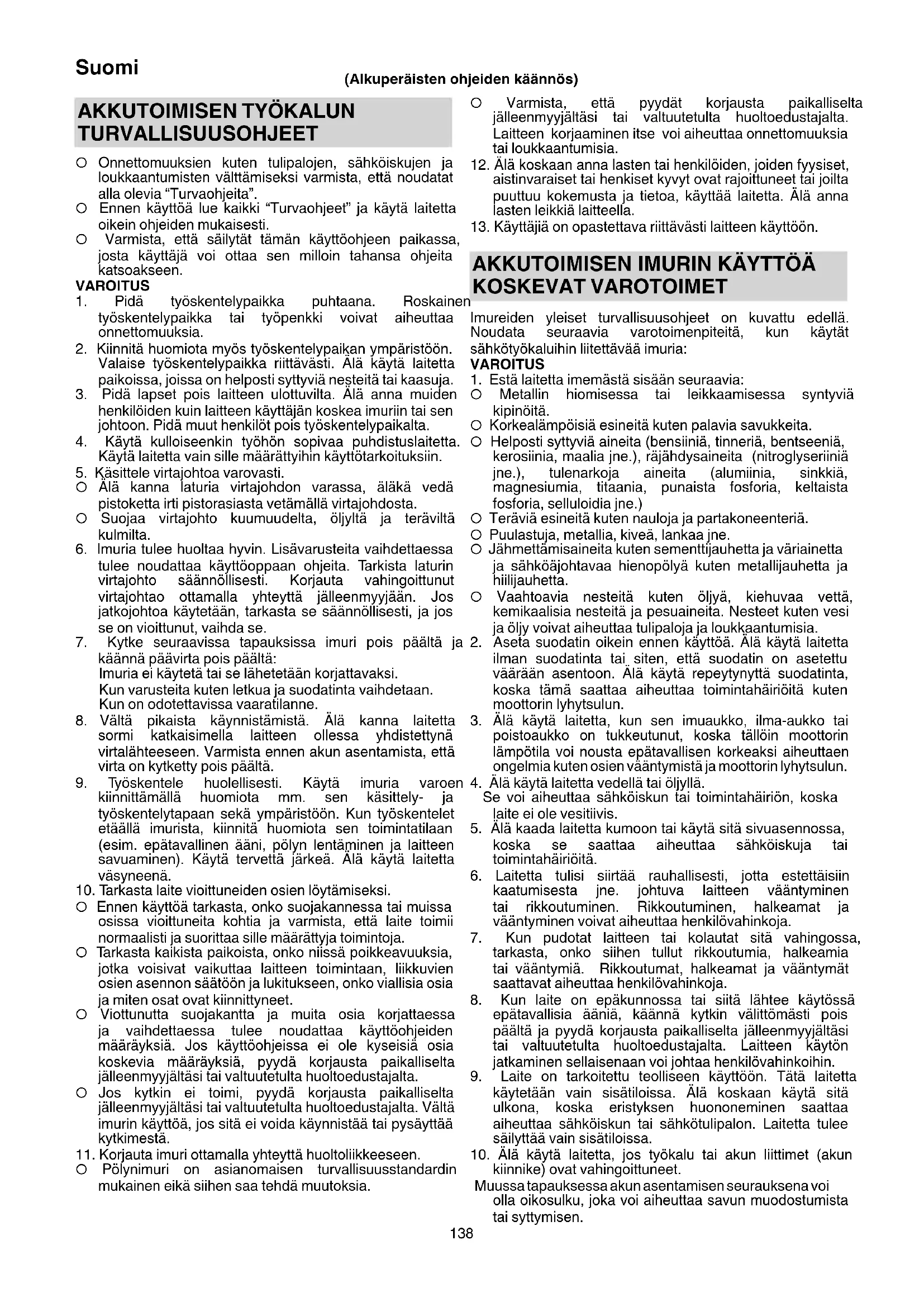 KOSKEVAT VAROTOIMET Imureiden yleiset turvallisuusohjeet on kuvattu edellä. Noudata seuraavia varotoimenpiteitä, kun käytät sähkötyökaluihin liitettävää imuria: VAROITUS