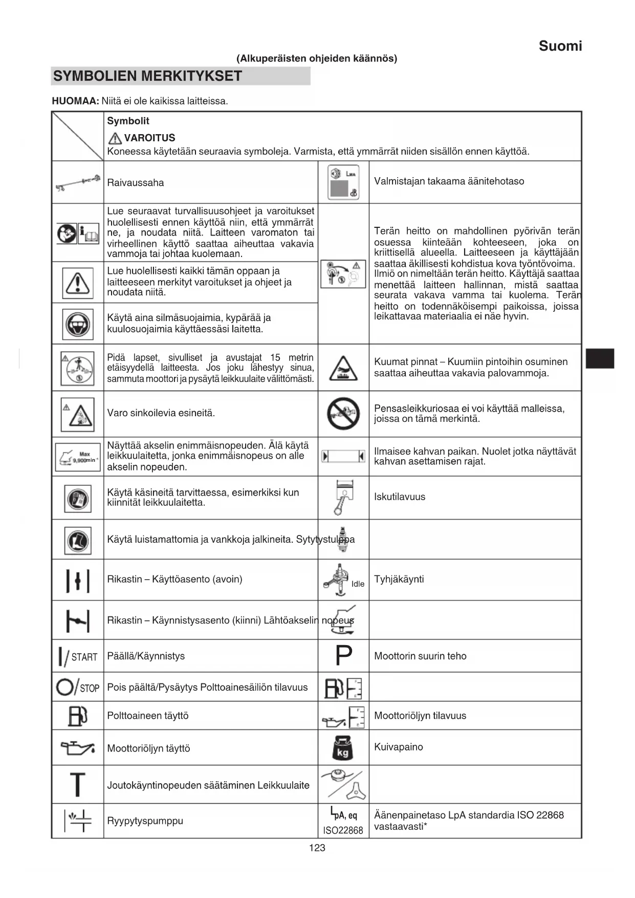 SYMBOLIEN MERKITYKSET HUOMAA: Niitä ei ole kaikissa laitteissa. (Alkuperäisten ohjeiden käännös) Symbolit VAROITUS Koneessa käytetään seuraavia symboleja. Varmista, että ymmärrät niiden sisällön ennen käyttöä. Raivaussaha Valmistajan takaama äänitehotaso Lue seuraavat turvallisuusohjeet ja varoitukset huolellisesti ennen käyttöä niin, että ymmärrät ne, ja noudata niitä. Laitteen varomaton tai virheellinen käyttö saattaa aiheuttaa vakavia vammoja tai johtaa kuolemaan. Terän heitto on mahdollinen pyörivän terän osuessa kiinteään kohteeseen, joka on kriittisellä alueella. Laitteeseen ja käyttäjään saattaa äkillisesti kohdistua kova työntövoima. Ilmiö on nimeltään terän heitto. Käyttäjä saattaa menettää laitteen hallinnan, mistä saattaa seurata vakava vamma tai kuolema. Terän heitto on todennäköisempi paikoissa, joissa leikattavaa materiaalia ei näe hyvin. Lue huolellisesti kaikki tämän oppaan ja laitteeseen merkityt varoitukset ja ohjeet ja noudata niitä. Käytä aina silmäsuojaimia, kypärää ja kuulosuojaimia käyttäessäsi laitetta. Pidä lapset, sivulliset ja avustajat 15 metrin etäisyydellä laitteesta. Jos joku lähestyy sinua, sammuta moottori ja pysäytä leikkuulaite välittömästi. Kuumat pinnat – Kuumiin pintoihin osuminen saattaa aiheuttaa vakavia palovammoja. Varo sinkoilevia esineitä. Pensasleikkuriosaa ei voi käyttää malleissa, joissa on tämä merkintä. min