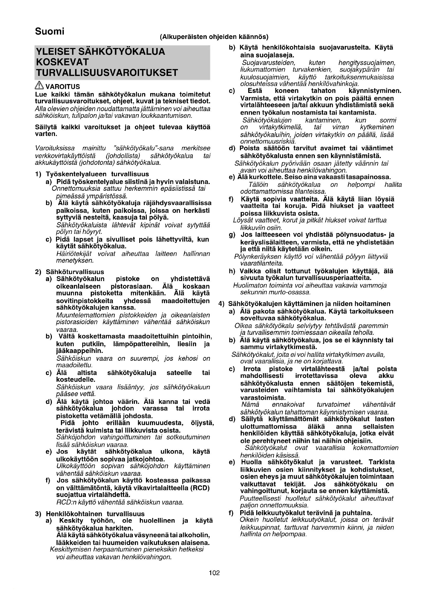 KOSKEVAT TURVALLISUUSVAROITUKSET VAROITUS Lue kaikki tämän sähkötyökalun mukana toimitetut turvallisuusvaroitukset, ohjeet, kuvat ja tekniset tiedot. Alla olevien ohjeiden noudattamatta jättäminen voi aiheuttaa sähköiskun, tulipalon ja/tai vakavan loukkaantumisen. Säilytä kaikki varoitukset ja ohjeet tulevaa käyttöä varten. Varoituksissa mainittu ”sähkötyökalu”-sana merkitsee verkkovirtakäyttöistä (johdollista) sähkötyökalua tai akkukäyttöistä (johdotonta) sähkötyökalua.