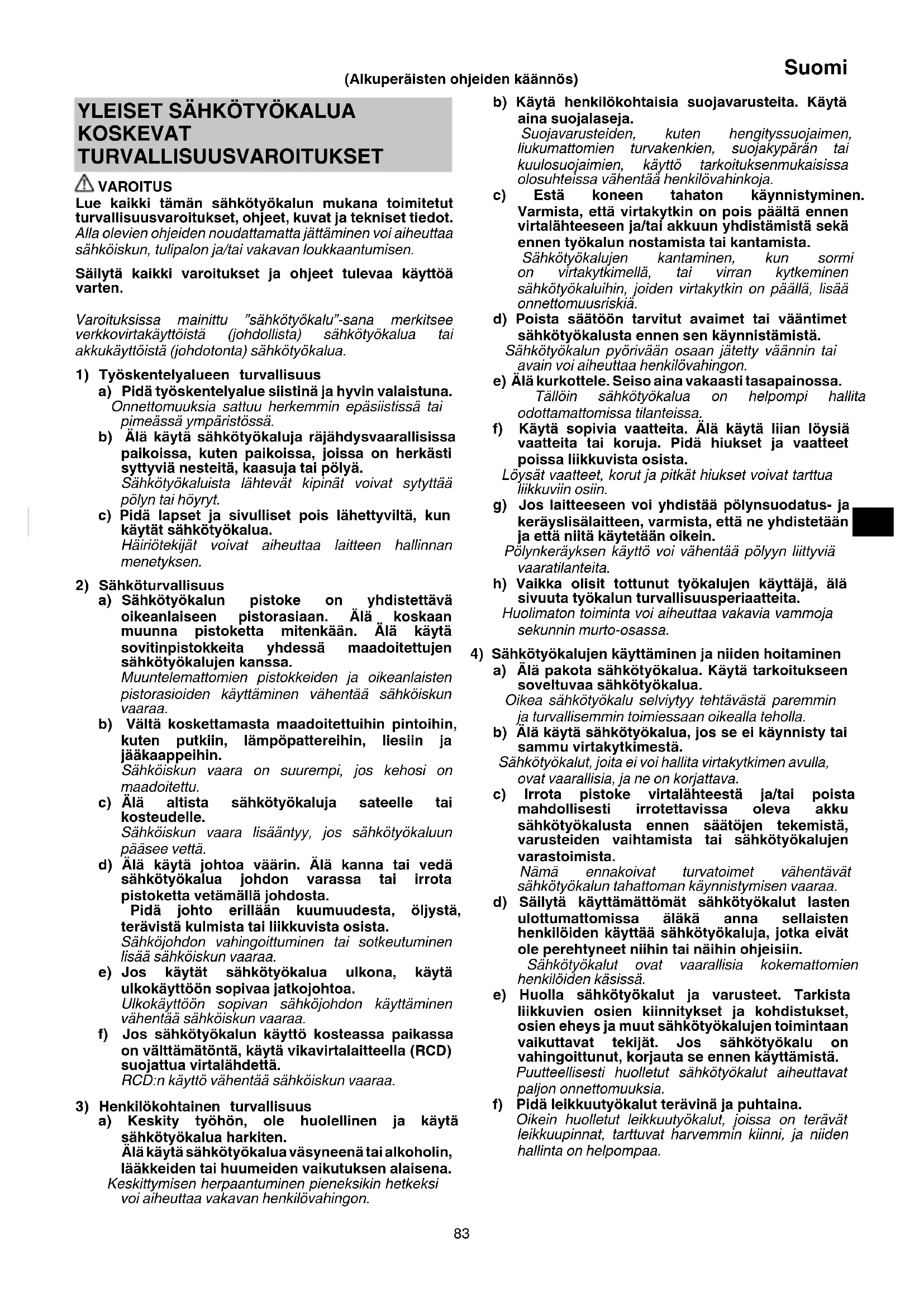 KOSKEVAT TURVALLISUUSVAROITUKSET VAROITUS Lue kaikki tämän sähkötyökalun mukana toimitetut turvallisuusvaroitukset, ohjeet, kuvat ja tekniset tiedot. Alla olevien ohjeiden noudattamatta jättäminen voi aiheuttaa sähköiskun, tulipalon ja/tai vakavan loukkaantumisen. Säilytä kaikki varoitukset ja ohjeet tulevaa käyttöä varten. Varoituksissa mainittu ”sähkötyökalu”-sana merkitsee verkkovirtakäyttöistä (johdollista) sähkötyökalua tai akkukäyttöistä (johdotonta) sähkötyökalua.