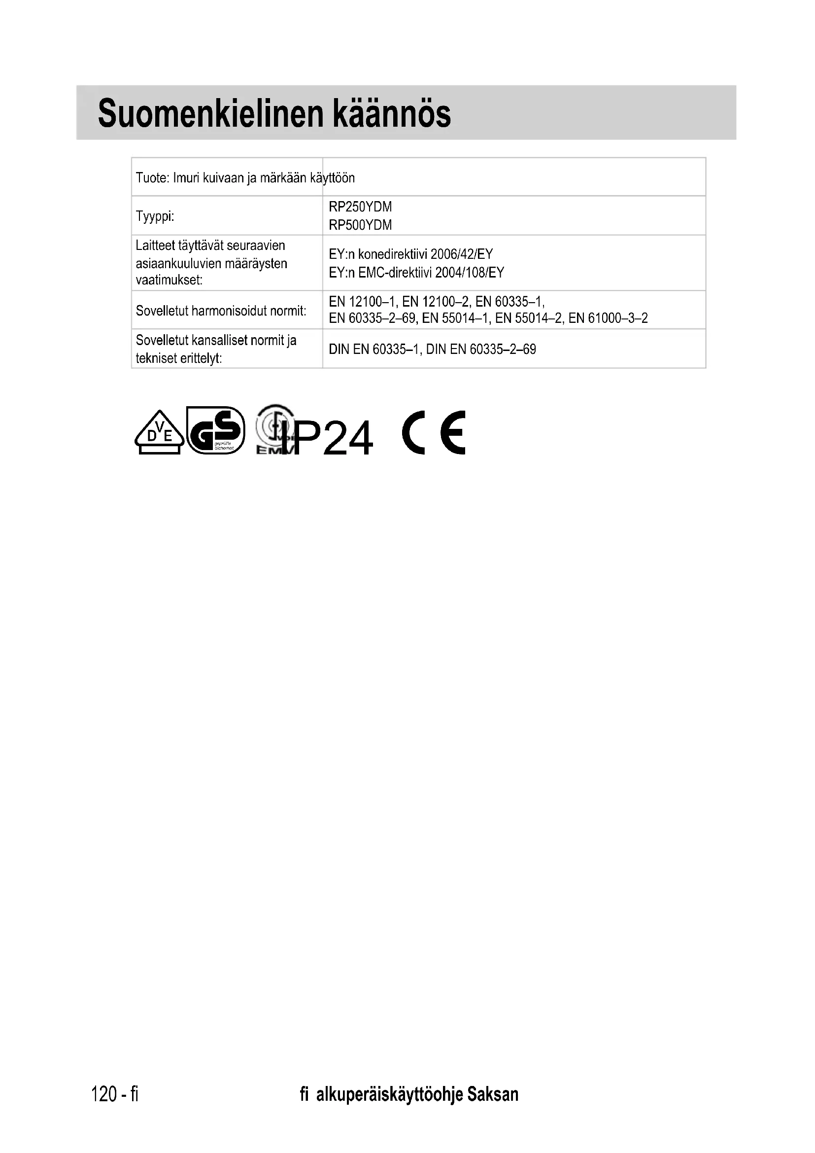 l VAARA! ▶Tukehtumisvaara ● Pakkausmateriaaleja, kuten foliopusseja, ei saa antaa lasten käsiin. ▶Imurin päälle ei saa nousta eikä sen päällä saa istua. ▶Imuria on käytettävä erityisen varovaisesti imuroitaessa portaita. Muista seistä tukevassa asennossa. ▶Liitäntäjohtoa ja imuletkua ei saa vetää terävien reunojen ylitse, taittaa eikä saattaa puristuksiin. ▶Liitäntäjohto ja imuletku on aina vedettävä siten, ettei kukaan voi kompastua niihin. ▶Imuri on sammutettava välittömästi, jos siitä alkaa pursuta ulos vaahtoa tai nestettä. ▶Kannen sisäpinta tulee aina pitää kuivana. ▶Imuria ja sen lisävarusteita ei saa käyttää, jos: ● imurissa on silminnähtäviä vaurioita (halkeamia tai murtumia) ● sähköjohto on viallinen tai siinä on murtumia tai käyttöiän mukana tuomia kulumia ● on aihetta olettaa, että laitteessa voi olla vika, joka ei näy (kaatumisen jäl- keen). ▶Pyörivien sähköharjojen ei saa antaa koskettaa sähköjohtoa. l VAARA! ▶Imuria ei saa käyttää räjähdysalttiissa tiloissa. ▶Imuri on pidettävä loitolla syttyvistä kaasuista ja aineista. l VAARA! ▶Imurilla ei saa imeä palavia eikä räjähtäviä liuotusaineita, liuotusaineeseen upotettua tavaraa, räjähdysaltista pölyä, sellaisia nesteitä kuten bensaa, öljyä, alkoholia tai ohennetta eikä kohteita, joiden lämpötila ylittää 60 °C. ▷Tällöin saattaisi syntyä palamis- ja räjähdysvaara! l VAARA! ▶Korjaustoimet tulee jättää ala ammattilaisille, eli esim. valmistajan asiakaspal- velulle. Laitteessa tulee käyttää ainoastaan alkuperäisvaraosia. ▶Väärin suoritetut korjaustoimenpiteet voivat aiheuttaa vaaratilanteita käyttäjälle. 000BookRP250YDM.indb121000BookRP250YDM.indb121 2019/10/266:35:492019/10/266:35:49122 - fi l VAARA! ▶Imurissa olevaa pistorasiaa tulee käyttää pelkästään käyttöohjeessa mainittui- hin tarkoituksiin. ▶Valmistaja ei vastaa tarkoitusten vastaisen, väärän käytön tai väärin suoritetun korjaustoimen aiheuttamista vahingoista. ▶Laitteessa ei saa käyttää vaurioituneita jatkojohtoja. ▶Imurin sähköjohdon vaurioituessa johto on vaihdettava valmistajalta tai tämän asiakaspalvelusta saatavaan erityisvalmisteiseen sähköjohtoon. ▶Jos laitteessa käytetään sähköharjaa, pyörivän sähköharjan ei saa antaa kos- kettaa sähköjohtoa. ▶Sähköverkon jännitteen on vastattava tyyppikilvessä mainittua jännitettä. ▶Imuri on sammutettava ja sen pistoke on irrotettava jokaisen käyttökerran jälkeen ja aina ennen huoltoa. ▶Pistoke tulee irrottaa vetäen itse pistokkeesta eikä sähköjohdosta. ▶Sähköjohtoa ei saa kytkeä virtaverkkoon eikä irrottaa virtaverkosta märin käsin. ▶Virransyötön on oltava suojattu sopivan vahvuisella sulakkeella. ▶Imuria ei saa koskaan avata sateessa eikä ukonilmalla ulkona. l VAROITUS! ▶Pölyluokan L imurit soveltuvat kuivan, palamattoman, terveydelle vaarattomien pölyjen imurointiin > 1mg/m³ työpaikkaraja-arvoilla. ▶Luokan M imurit soveltuvat kuivien, palamattomien pölyjen, palamattomi- en nesteiden, puupölyn ja vaarallisten pölyjen (työpaikan raja-arvon olles- sa ≥ 0,1 mg/m³) imemiseen. ▶Luokan H imurit soveltuvat kuivien, palamattomien pölyjen, syöpää aiheuttavi- en ja tauteja tartuttavien hiukkasten sekä palamattomien nesteiden, puupölyn ja myrkyllistä pölyä kaikki työperäisen altistumisen raja-arvoja. 000BookRP250YDM.indb122000BookRP250YDM.indb122 2019/10/266:35:492019/10/266:35:49fi - 123