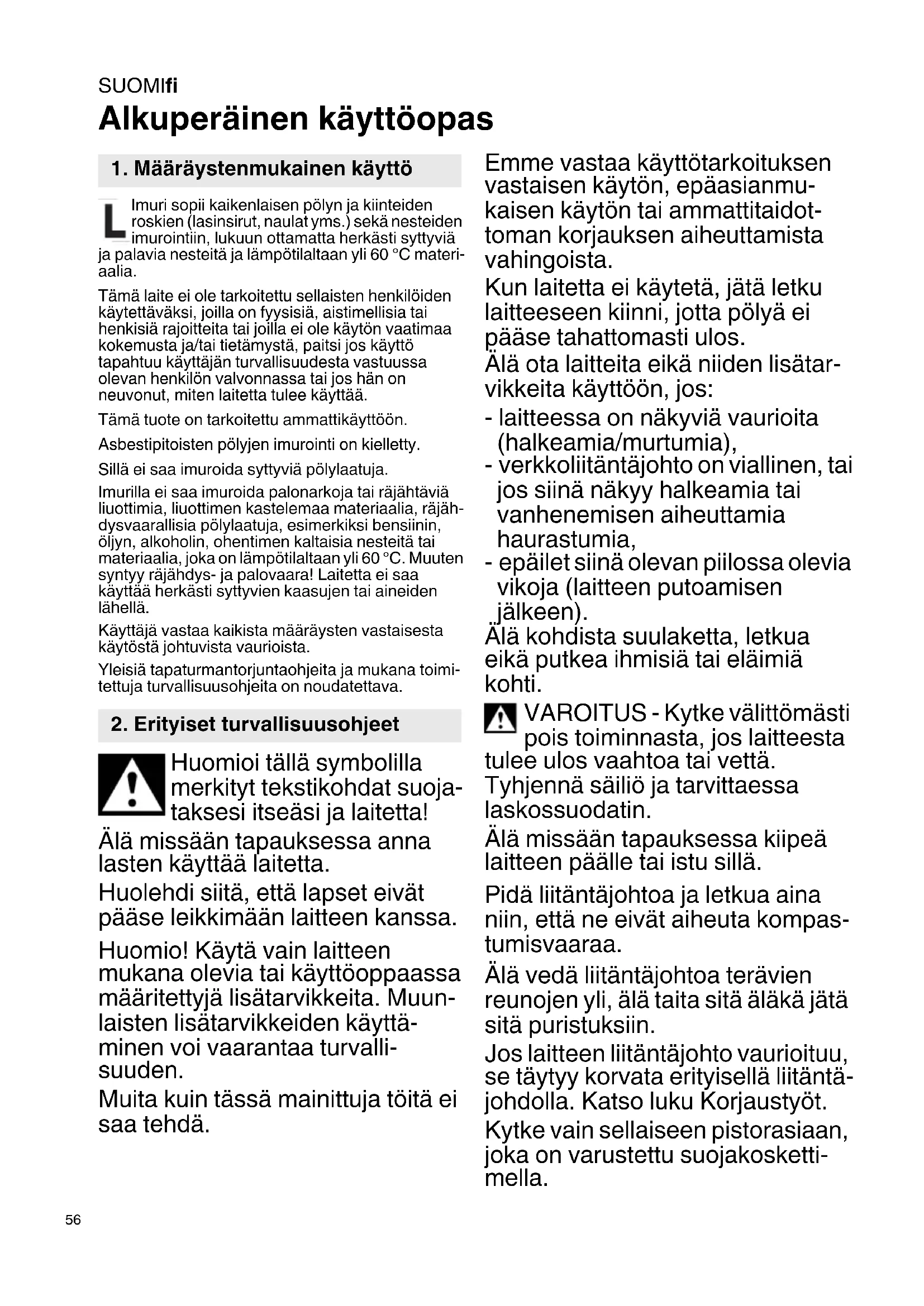 Alkuperäinen käyttöopas Imuri sopii kaikenlaisen pölyn ja kiinteiden roskien (lasinsirut, naulat yms.) sekä nesteiden imurointiin, lukuun ottamatta herkästi syttyviä ja palavia nesteitä ja lämpötilaltaan yli 60 °C materi- aalia. Tämä laite ei ole tarkoitettu sellaisten henkilöiden käytettäväksi, joilla on fyysisiä, aistimellisia tai henkisiä rajoitteita tai joilla ei ole käytön vaatimaa kokemusta ja/tai tietämystä, paitsi jos käyttö tapahtuu käyttäjän turvallisuudesta vastuussa olevan henkilön valvonnassa tai jos hän on neuvonut, miten laitetta tulee käyttää. Tämä tuote on tarkoitettu ammattikäyttöön. Asbestipitoisten pölyjen imurointi on kielletty. Sillä ei saa imuroida syttyviä pölylaatuja. Imurilla ei saa imuroida palonarkoja tai räjähtäviä liuottimia, liuottimen kastelemaa materiaalia, räjäh- dysvaarallisia pölylaatuja, esimerkiksi bensiinin, öljyn, alkoholin, ohentimen kaltaisia nesteitä tai materiaalia, joka on lämpötilaltaan yli 60 °C. Muuten syntyy räjähdys- ja palovaara! Laitetta ei saa käyttää herkästi syttyvien kaasujen tai aineiden lähellä. Käyttäjä vastaa kaikista määräysten vastaisesta käytöstä johtuvista vaurioista. Yleisiä tapaturmantorjuntaohjeita ja mukana toimi- tettuja turvallisuusohjeita on noudatettava. Huomioi tällä symbolilla merkityt tekstikohdat suoja- taksesi itseäsi ja laitetta! Älä missään tapauksessa anna lasten käyttää laitetta. Huolehdi siitä, että lapset eivät pääse leikkimään laitteen kanssa. Huomio! Käytä vain laitteen mukana olevia tai käyttöoppaassa määritettyjä lisätarvikkeita. Muun- laisten lisätarvikkeiden käyttä- minen voi vaarantaa turvalli- suuden. Muita kuin tässä mainittuja töitä ei saa tehdä. Emme vastaa käyttötarkoituksen vastaisen käytön, epäasianmu- kaisen käytön tai ammattitaidot- toman korjauksen aiheuttamista vahingoista. Kun laitetta ei käytetä, jätä letku laitteeseen kiinni, jotta pölyä ei pääse tahattomasti ulos. Älä ota laitteita eikä niiden lisätar- vikkeita käyttöön, jos: - laitteessa on näkyviä vaurioita (halkeamia/murtumia), - verkkoliitäntäjohto on viallinen, tai jos siinä näkyy halkeamia tai vanhenemisen aiheuttamia haurastumia, - epäilet siinä olevan piilossa olevia vikoja (laitteen putoamisen jälkeen). Älä kohdista suulaketta, letkua eikä putkea ihmisiä tai eläimiä kohti. VAROITUS - Kytke välittömästi pois toiminnasta, jos laitteesta tulee ulos vaahtoa tai vettä. Tyhjennä säiliö ja tarvittaessa laskossuodatin. Älä missään tapauksessa kiipeä laitteen päälle tai istu sillä. Pidä liitäntäjohtoa ja letkua aina niin, että ne eivät aiheuta kompas- tumisvaaraa. Älä vedä liitäntäjohtoa terävien reunojen yli, älä taita sitä äläkä jätä sitä puristuksiin. Jos laitteen liitäntäjohto vaurioituu, se täytyy korvata erityisellä liitäntä- johdolla. Katso luku Korjaustyöt. Kytke vain sellaiseen pistorasiaan, joka on varustettu suojakosketti- mella.