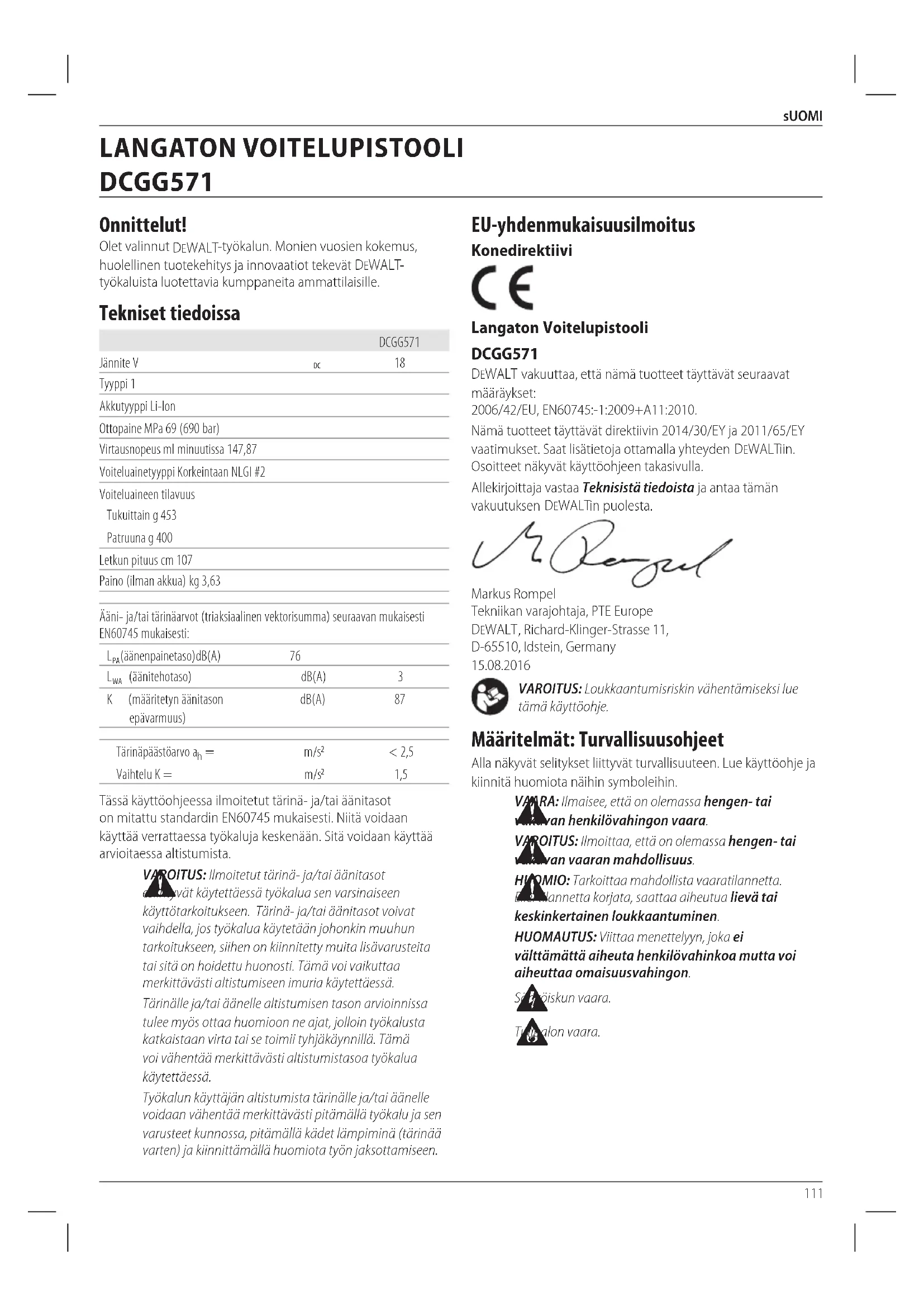 - litiumioniakkujen ovat kierrätettäviä. Vie ne jälleenmyyjälle tai paikalliseen kierrätyspisteeseen. Kerätyt akkuyksiköt kierrätetään tai hävitetäänoikein. Vianetsintä Ongelma Mahdollinen syy Mahdollinen ratkaisu Varren takaisin veto ei onnistu Tyhjiön kertyminen Ruuvaa tyhjennysventtiili auki tyhjiön vapauttamiseksi. Vartta ei voida painaa eteenpäin Paineen kertyminen Ruuvaa tyhjennysventtiili auki paineen vapauttamiseksi. Varsi on edelleen kiinni männässä Kierrä voiteluputken kahvaa 90 astetta sen irrottamiseksi. Ei voiteluainetta, kun liipaisimesta painetaan Voiteluputki on tyhjä Lisää voiteluainetta. Voiteluputkessa on ilmataskuja Katso kohta Ilmataskujen tyhjennys. Takaiskuventtiili on tukossa Katso kohta Epäpuhtauksien puhdistaminen takaiskuventtiilistä. Suodatin on tukossa Katso kohta Epäpuhtauksien puhdistaminen suodattimesta. Varoventtiilissä on voiteluainetta Zerk-liitos on tukossa Irrota kiinnitin liitoksesta, puhdista Zerk-liitos sekä voiteluainekanava. Moottori ei käynnisty, kun liipaisinta painetaan Akku Varmista, että akku on ladattu täyteen. Voiteluainetta tulee voiteluputken takaosasta Kumitiiviste on käännetty virheelliseen suuntaan Katso kohta Voitelupistoolin valmisteleminen imu- ja täyttöpumppua varten.122 sVEnska EC-Följsamhetsdeklaration Maskindirektiv Sladdlös Fettspruta DCGG571 DeWALT deklarerar att dessa produkter, beskrivna under Tekniska data uppfyller: 2006/42/EC, EN60745:-1:2009+A11:2010. Dessa produkter uppfyller också direktiv 2014/30/EU och 2011/65/EU. För mer information, var god kontakta DeWALT