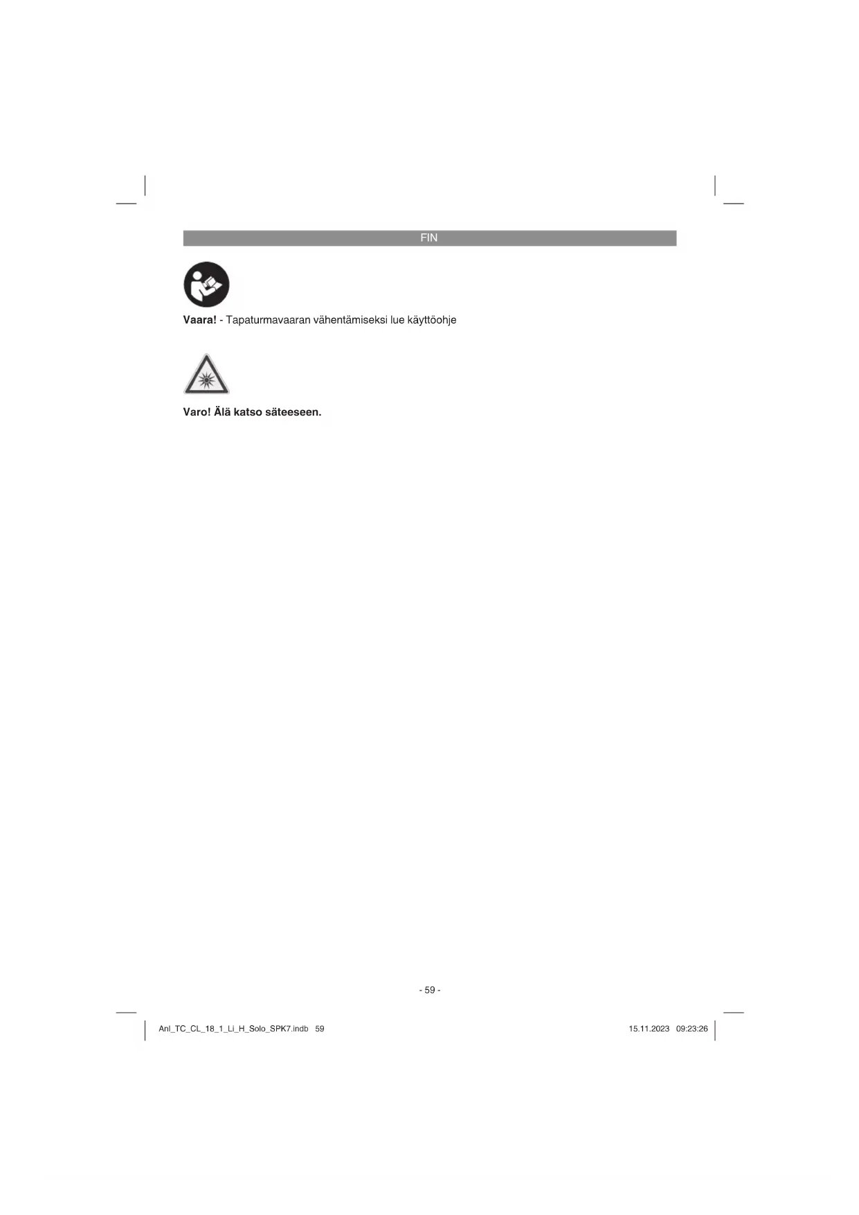 Vaara! - Tapaturmavaaran vähentämiseksi lue käyttöohje Varo! Älä katso säteeseen. Anl_TC_CL_18_1_Li_H_Solo_SPK7.indb 59Anl_TC_CL_18_1_Li_H_Solo_SPK7.indb 59 15.11.2023 09:23:2615.11.2023 09:23:26FIN