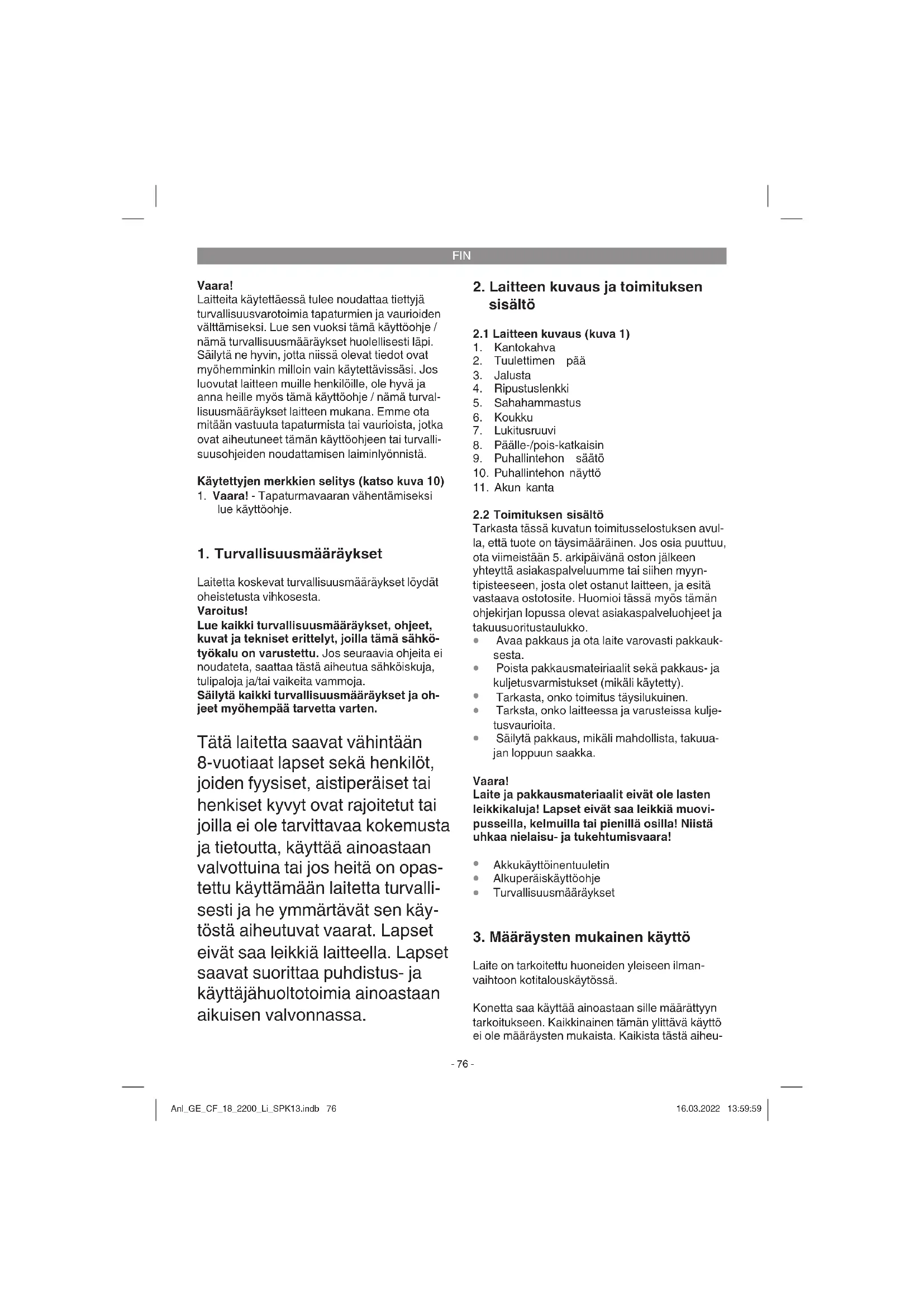 Laite on tarkoitettu huoneiden yleiseen ilman- vaihtoon kotitalouskäytössä. Konetta saa käyttää ainoastaan sille määrättyyn tarkoitukseen. Kaikkinainen tämän ylittävä käyttö ei ole määräysten mukaista. Kaikista tästä aiheu- Anl_GE_CF_18_2200_Li_SPK13.indb 76Anl_GE_CF_18_2200_Li_SPK13.indb 76 16.03.2022 13:59:5916.03.2022 13:59:59FIN
