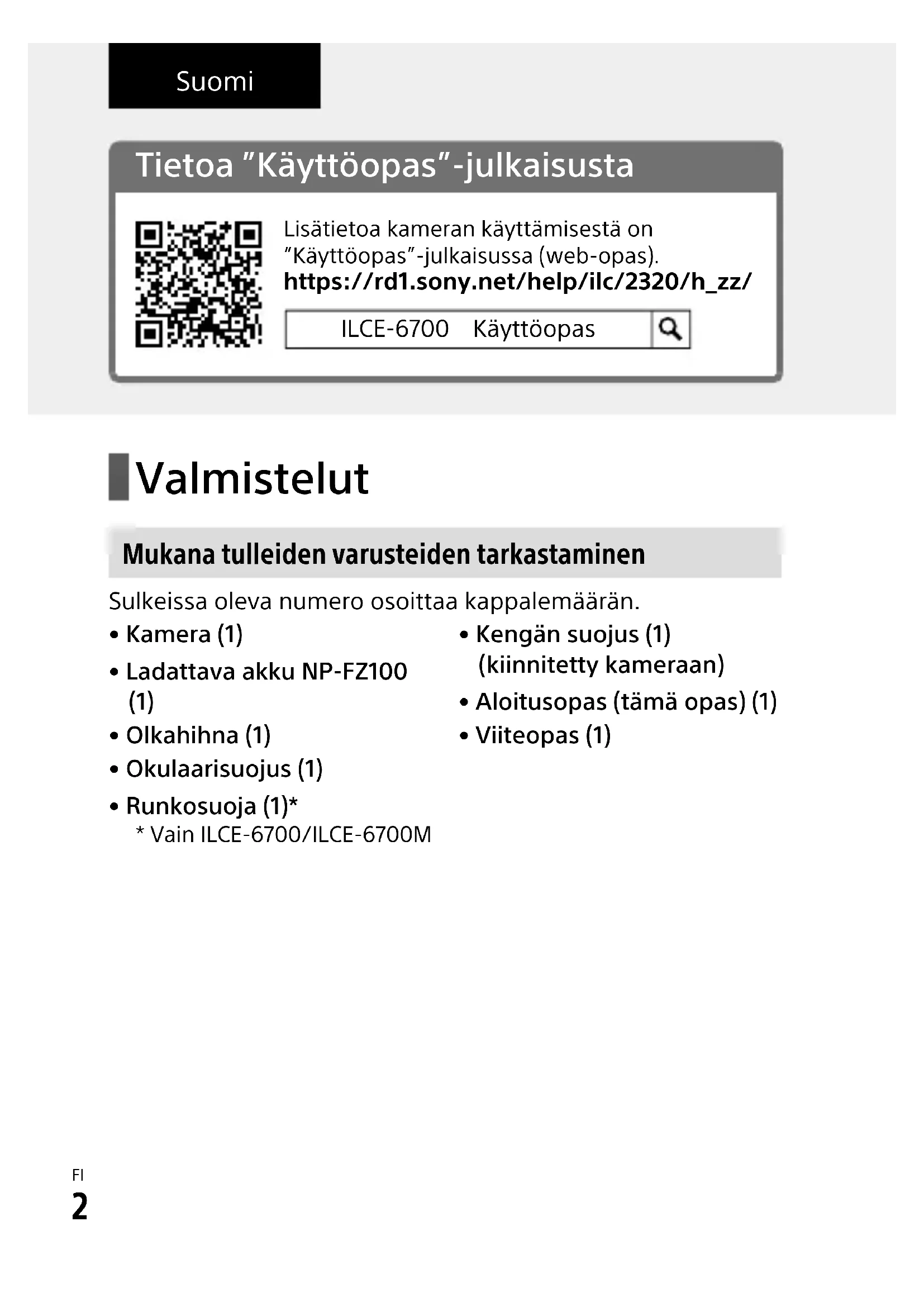 Tietoa ”Käyttöopas”-julkaisusta Lisätietoa kameran käyttämisestä on ”Käyttöopas”-julkaisussa (web-opas).https://rd1.sony.net/help/ilc/2320/h_zz/ILCE-6700 Käyttöopas Suomi Valmistelut Mukana tulleiden varusteiden tarkastaminen Sulkeissa oleva numero osoittaa kappalemäärän.• Kamera (1)• Ladattava akku NP-FZ100 (1)