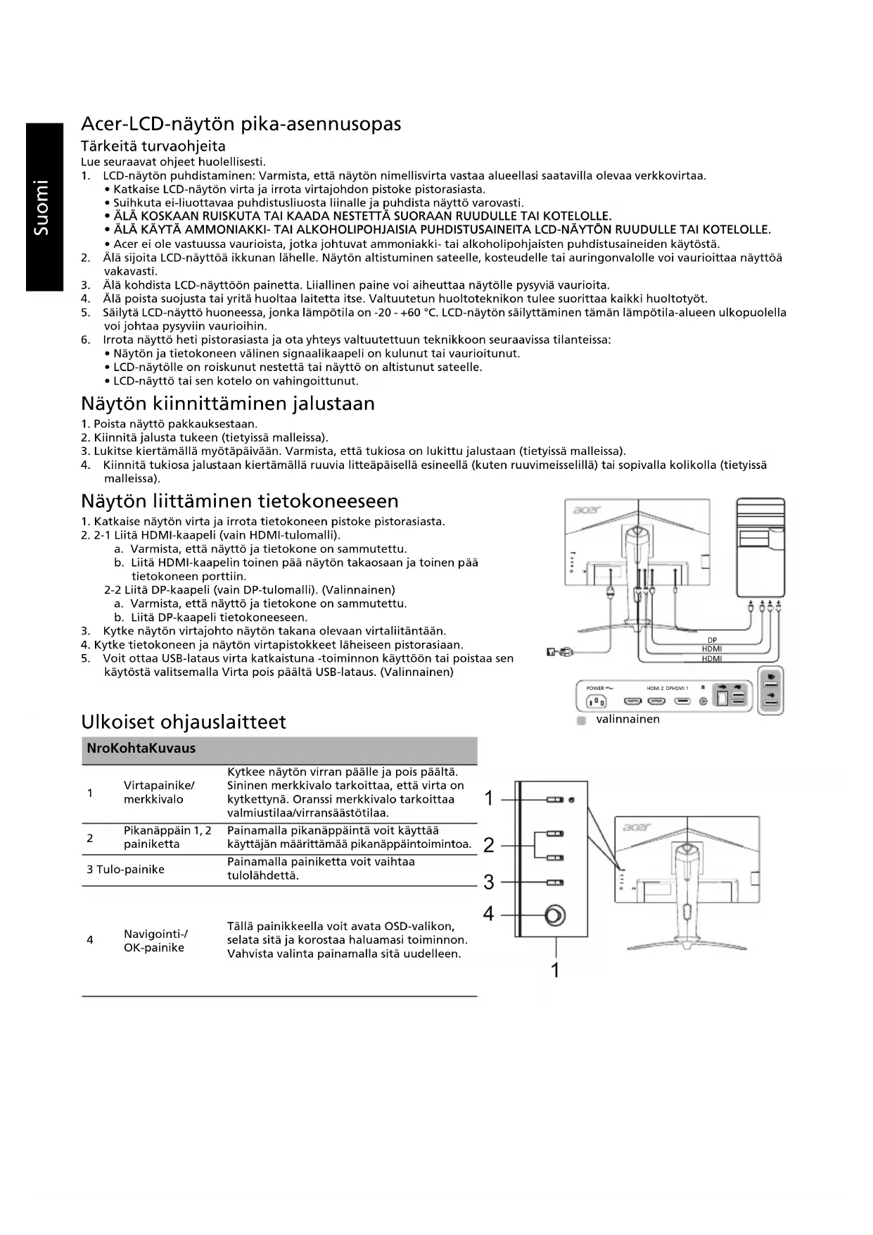 Kontrasti 100 000 000:1 enint. (ACM) Katselukulma 178° (V) 178° (P) (CR=10) Vasteaika 1 ms (G/G) / 0,5 ms (G/G, min.) Paneelityyppi In-Plane Switching (IPS) H-taajuus HDMI: 31 - 255 kHz DP: 255 - 255 kHz V-taajuus HDMI: 56 - 240 Hz DP: 48 - 240 Hz Näyttövärit 16,7 miljoonaa Pistekellotaajuus 600 MHz Enimmäistarkkuus 1920 x 1080 @ 240 Hz Plug & Play VESA DDCCI/DDC2B Energiatehokkuusluokka A *Vuosittainen energiankulutus 31 (kWh) (HDMI-tulomallissa) Virrankulutus (200 nitiä) Päällä 17,4 W (tyypillinen) Lepotila 0,45 W (tyypillinen) Pois 0,25 W (tyypillinen) Tuloliitäntä HDMI (vain HDMI-tulomalli) DP (vain DP-tulomalli) Videotulosignaali HDMI (vain HDMI-tulomalli) (valinnainen) DP (vain DP-tulomalli) (valinnainen) Kaiuttimet 2 W x 2 (vain äänitulomalli) (valinnainen) USB USB 3.0 x 4 (valinnainen) Näyttöruudun enimmäiskoko Vaakasuora: 543,744 mm Pystysuora: 302,616 mm Virtalähde 100–240 V, 50/60 Hz Ympäristötekijät Käyttölämpötila: 0–40 °C Varastointilämpötila: -20–+60 °C Ilmankosteus: 20–80 % Mitat 557,79 (L) x 397,84 ~ 512,84 (K) x 236,27 (S) mm Paino (netto) 5,30 kg (netto) Mekanismin tiedot Kallistus: -5°–+25° (kaltevuuskulman 25 asteen kallistus on mahdollinen vain korkeimmassa pisteessä) Kierto: -20°–+20° Korkeuden säätö: 0–115 mm Nivelöinti: -90°–+90° Irrotettava jalusta: Kyllä Ulkoiset ohjauslaitteet Vaihto/painikkeet Virtapainike Pikanäppäin 1 Pikanäppäin 2 Tulo Valikko/Navigointi/OK Toiminnot Kirkkaus Kontrasti Sininen valo Mustan vahvistus ACM HDR Superterävyys Gamma Värin lämpöisyys Tilat Väriavaruus Harmaasävytila 6-aksel. sävy 6-aksel. satur. Äänenvoim. Mykistä Ylivaihde Adaptive-Sync Virkist.taaj.num VRB Ultra-matala latenssi Tähtäyspiste Kieli Aikakatkaisu Läpikuultavuus Lukitse OSD Tulo Autom. lähde DP-muoto Pikanäppäinmääritys Laajakuva DDC/CI HDMI-mustan taso Pika-aloitustila Virta pois päältä USB-lataus Näyttötiedot Nollaa kaikki asetuks. Lopeta Kaikkia teknisiä tietoja voidaan muuttaa ilman ennakkoilmoitusta.Norsk Hurtigstartveiledning (QSG) for LCD-skjerm fra Acer Viktige sikkerhetsinstruksjoner Les følgende instruksjoner nøye.