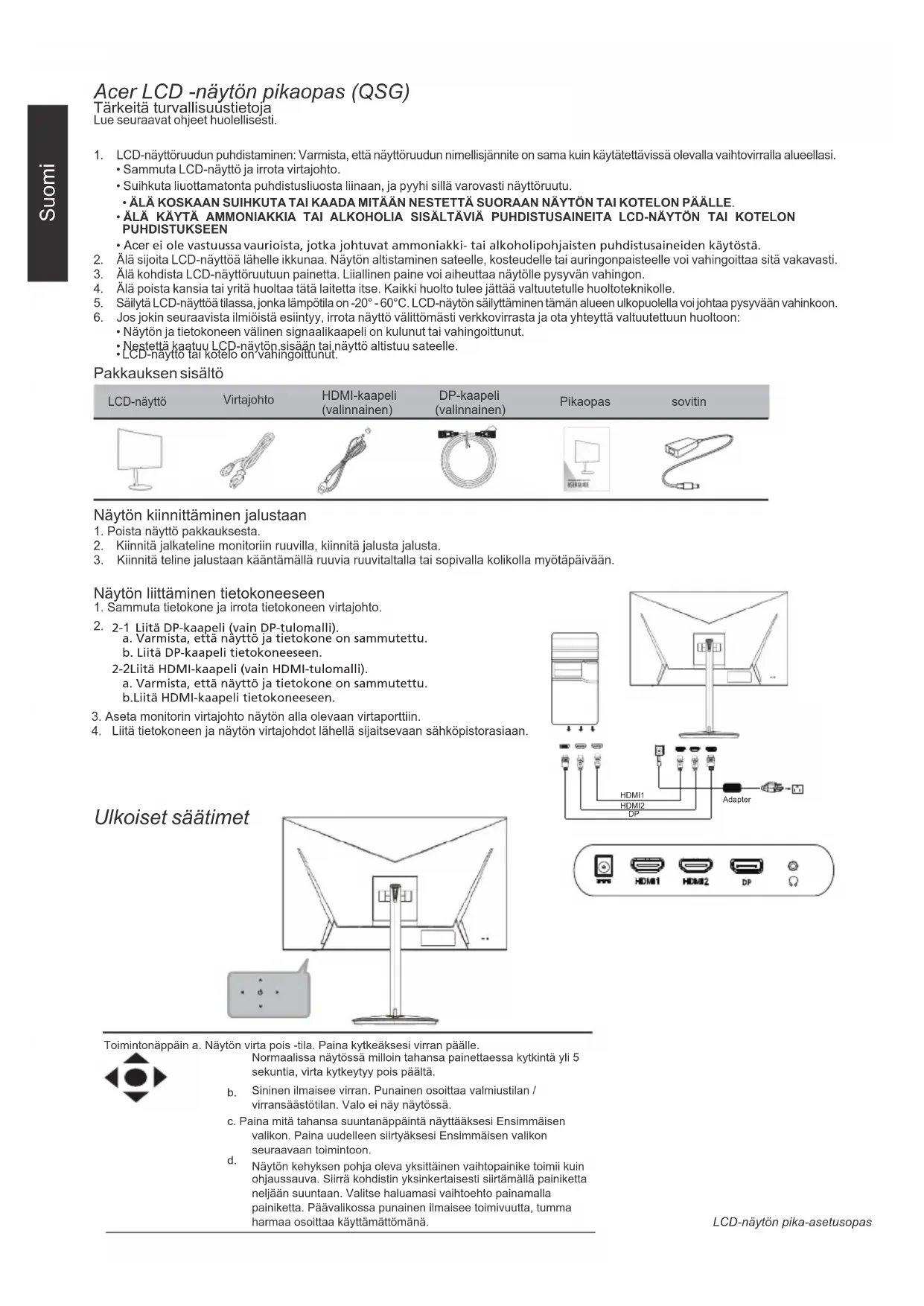 - Kysy neuvoa laitteen myyjältä tai kokeneelta radio- tai TV-asentajalta. CE-yhdenmukaisuusilmoitus Acer Inc., ilmoittaa täten, että tämä LCD-näyttö on EMC-direktiivin 2014/30/EU, matalajännitedirektiivin 2014/35/ EU ja RoHS-direktiivin 2011/65/EY olennaisten vaatimusten ja muiden asiaankuuluvien lisäysten mukainen ja energiaan liittyvien tuotteiden ekologisen suunnittelun vaatimuksille asetettavia puitteita koskevan direktiivin 2009/125/EY mukainen. Huomautus: Suojatut kaapelit Kaikki liitännät muihin tietokonelaitteisiin tulee tehdä suojatuilla kaapeleilla, jotta EMC-säännökset täyttyvät. Huomautus: Oheislaitteet Vain varmennetusti luokan B vaatimusten mukaisia oheislaitteita (tulo/lähtölaitteet, päätteet, tulostimet, jne.) voi liittää tähän laitteeseen. Varmentamattomien oheislaitteiden käyttö johtaa todennäköisesti häiriöihin radio- ja TV-vastaanotossa. Varoitus Muutokset tai mukautukset, joita valmistaja ei ole nimenomaisesti hyväksynyt, voivat mitätöidä Federal Communications Commissionin käyttäjälle myöntämän oikeuden käyttää tätä tuotetta. Käyttöolosuhteet Tämä laite on FCC-sääntöjen osan 15 mukainen. Käyttö on kahden seuraavan ehdon alainen: (1) tämä laite ei aiheuta haitallista häiriötä ja (2) tämän laitteen on hyväksyttävä kaikki vastaanotettu häiriö, mukaan luettuna häiriö, joka saattaa aiheuttaa epätoivottavaa toimintaa. Huomautus: Käyttö Kanadassa Tämä luokan B digitaalinen laite on Kanadan ICES-003-normin mukainen. Remarque à l'intention des utilisateurs canadiens Cet appareil numérique de la classe B est conforme a la norme NMB-003 du Canada. Käyttäjän elektroniikkajätteen hävittäminen yksityistalouksissa Euroopan unionissa Tämä symboli tuotteessa tai sen pakkauksessa ilmaisee, että tätä tuotetta ei saa hävittää kotitalousjätteen mukana. Sen sijaan on sinun vastuullasi hävittää oma elektroniikkajätteesi toimittamalla se siihen erityisesti varattuun sähkö- ja elektroniikkalaiteromun kierrätyspisteeseen. Keräämällä ja kierrättämällä elektroniikkaromun sen käyttöiän päässä erityisissä keräyspisteissä autamme säästämään luonnonvaroja ja varmistamaan, että romu kierrätetään tavalla, joka suojelee ihmisen ja ympäristön terveyttä. Saadaksesi lisätietoja, mihin voit jättää elektroniikkaromusi kierrätettäväksi, ota yhteyttä paikallisviranomaisiin, kotitaloutesi jätehuollosta vastaavaan yritykseen tai liikkeeseen, josta ostit tuotteen. Jotta monitori ei vahingoitu, Älä nosta näyttöä sen jalustasta. Acer-näyttö on tarkoitettu elektronisista laitteista saatujen tietojen video-ja visuaaliseen näyttämiseen. FreeSync (vain HDMI/DP): Antaa FreeSync-tuetun grafiikkalähtee säätää dynaamisesti virkistystaajuutta perustuen tyypilliseen sisällön kuvanopeuteen virtatehokasta, miltei tärinätöntä ja viiveetöntä näytön päivitystä varten.Suomi TEKNISET TIEDOT Mallin nimi LCD-paneeli Järjestelmä TFT väri-LCD Koko Pikselietäisyys Kirkkaus 400 nitsiä (tyyp.) Kontrasti 100000000:1 Maks (DCR) Katsottavissa oleva kulma