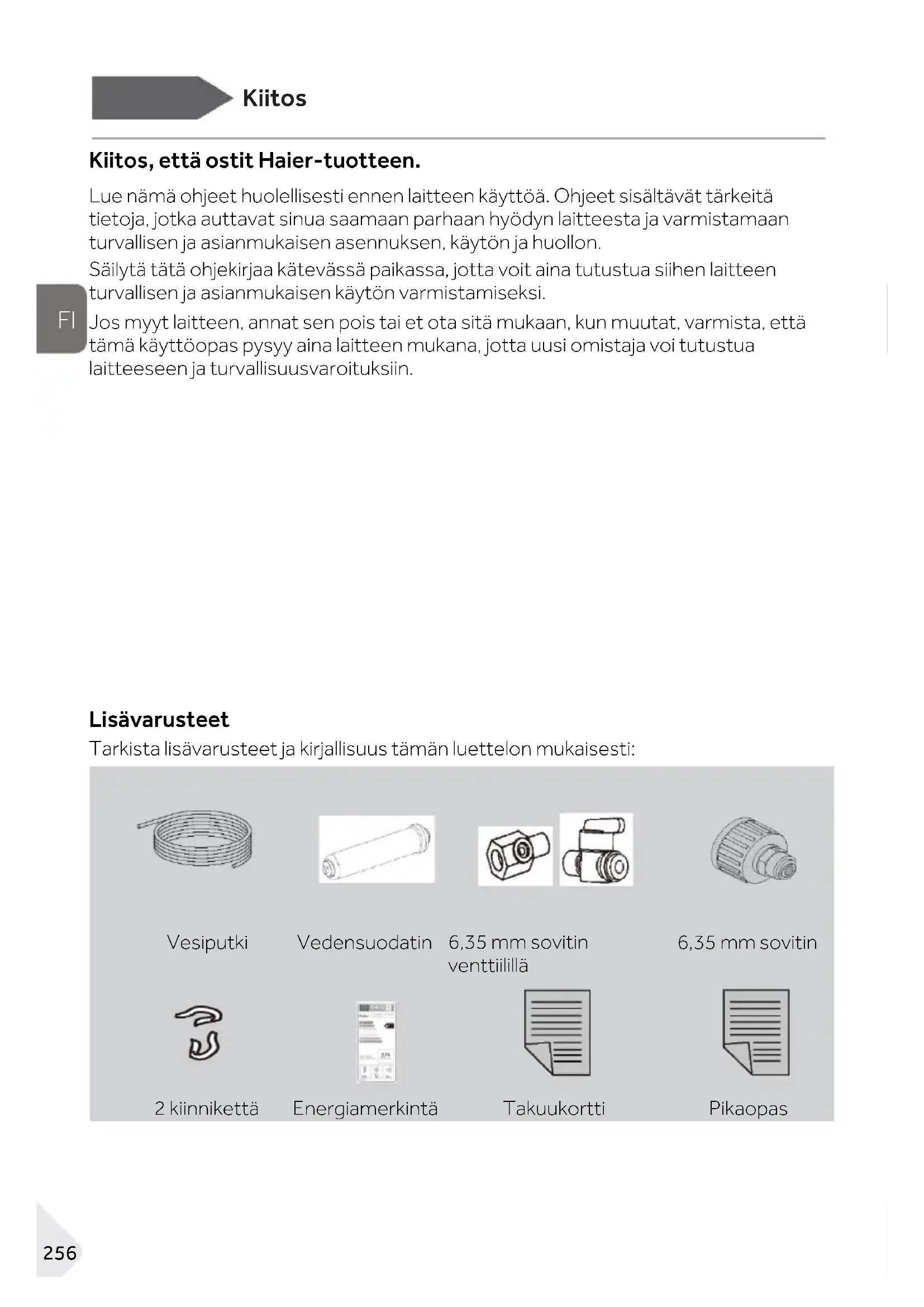 Kiitos, että ostit Haier-tuotteen. Lue nämä ohjeet huolellisesti ennen laitteen käyttöä. Ohjeet sisältävät tärkeitä tietoja, jotka auttavat sinua saamaan parhaan hyödyn laitteesta ja varmistamaan turvallisen ja asianmukaisen asennuksen, käytön ja huollon. Säilytä tätä ohjekirjaa kätevässä paikassa, jotta voit aina tutustua siihen laitteen turvallisen ja asianmukaisen käytön varmistamiseksi. Jos myyt laitteen, annat sen pois tai et ota sitä mukaan, kun muutat, varmista, että tämä käyttöopas pysyy aina laitteen mukana, jotta uusi omistaja voi tutustua laitteeseen ja turvallisuusvaroituksiin. Lisävarusteet Tarkista lisävarusteet ja kirjallisuus tämän luettelon mukaisesti: