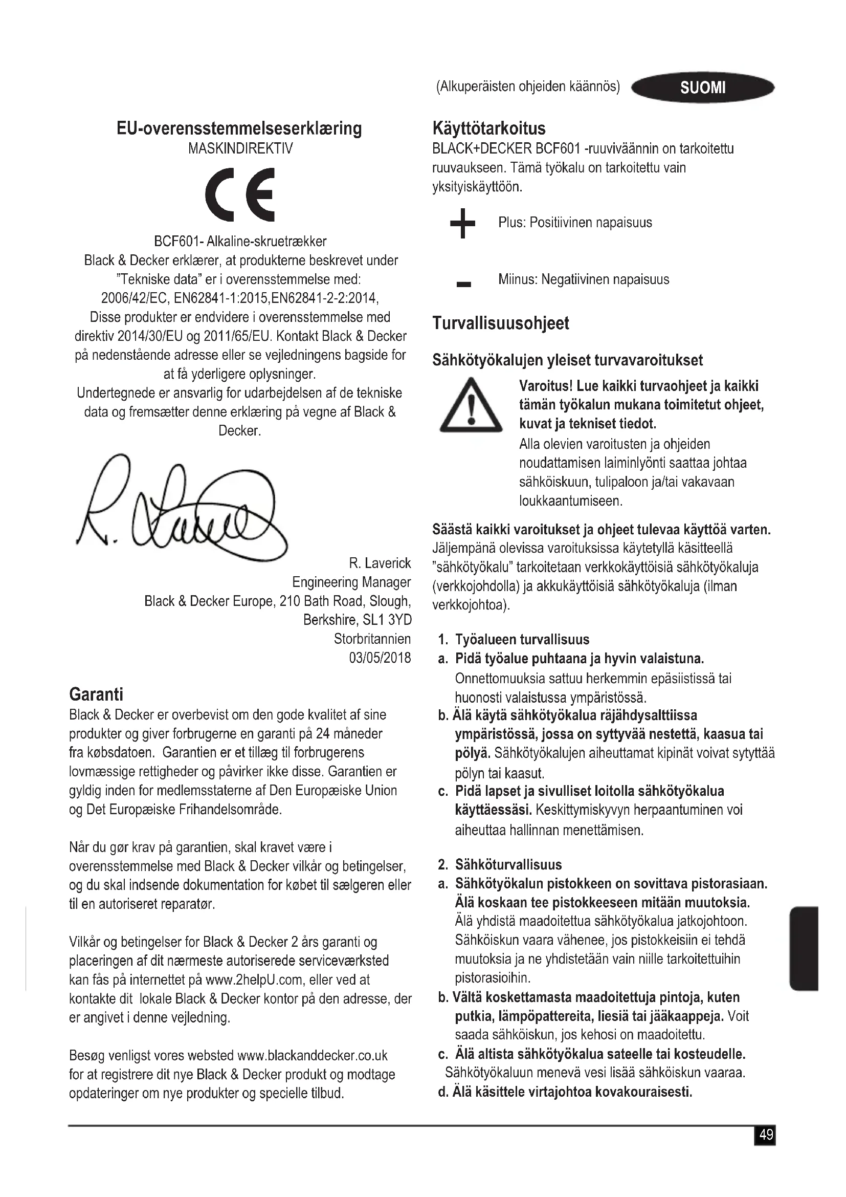 BCF601 - Alkalinen ruuviväännin Black & Decker ilmoittaa, että tuotteet, jotka on kuvattu kohdassa ”Tekniset tiedot” ovat seuraavien direktiivien vaatimusten mukaisia: 2006/42/EY, EN62841-1:2015, EN62841-2-2:2014. Nämä tuotteet täyttävät myös direktiivien 2014/30/EU ja 2011/65/EU vaatimukset. Lisätietoja saa ottamalla yhteyden Black & Deckeriin seuraavassa osoitteessa. Tiedot ovat myös käyttöohjeen takakannessa. Allekirjoittanut vastaa teknisten tietojen kokoamisesta tehden tämän ilmoituksen Black & Deckerin puolesta. R. Laverick Engineering Manager Black & Decker Europe, 210 Bath Road, Slough, Berkshire, SL1 3YD Iso-Britannia