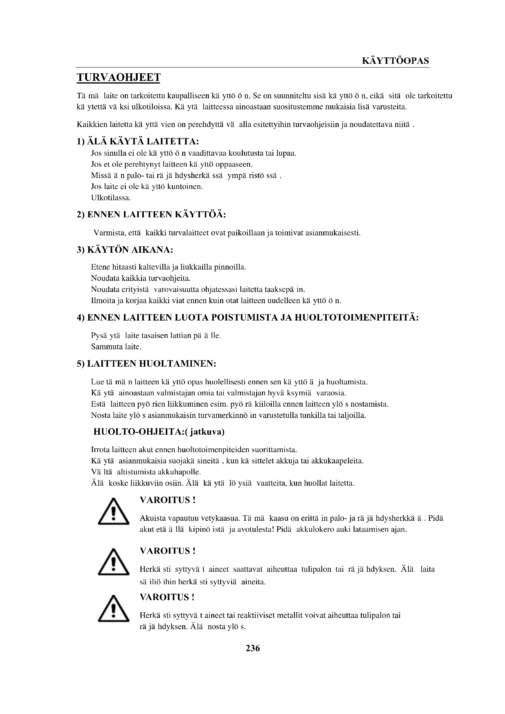 Lue tämän laitteen käyttöopas huolellisesti ennen sen käyttöä ja huoltamista. Käytä ainoastaan valmistajan omia tai valmistajan hyväksymiä varaosia. Estä laitteen pyörien liikkuminen esim. pyöräkiiloilla ennen laitteen ylös nostamista. Nosta laite ylös asianmukaisin turvamerkinnöin varustetulla tunkilla tai taljoilla. HUOLTO-OHJEITA:( jatkuva) Irrota laitteen akut ennen huoltotoimenpiteiden suorittamista. Käytä asianmukaisia suojakäsineitä, kun käsittelet akkuja tai akkukaapeleita. Vältä altistumista akkuhapolle. Älä koske liikkuviin osiin. Älä käytä löysiä vaatteita, kun huollat laitetta. VAROITUS ! Akuista vapautuu vetykaasua. Tämä kaasu on erittäin palo- ja räjähdysherkkää. Pidä akut etäällä kipinöistä ja avotulesta! Pidä akkulokero auki lataamisen ajan. VAROITUS ! Herkästi syttyvät aineet saattavat aiheuttaa tulipalon tai räjähdyksen. Älä laita säiliöihin herkästi syttyviä aineita. VA ROITUS ! Herkästi syttyvät aineet tai reaktiiviset metallit voivat aiheuttaa tulipalon tai räjähdyksen. Älä nosta ylös.KÄYTTÖOPAS