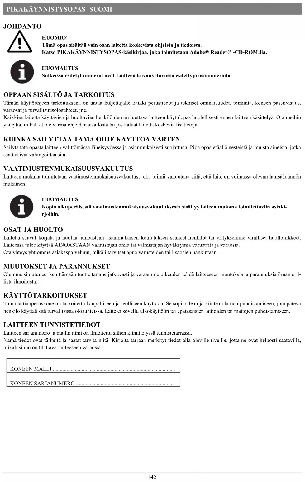 Tämä lattianperuskone on tarkoitettu kaupalliseen ja teolliseen käyttöön. Se sopii sileän ja kiinteän lattian puhdistamiseen, jota pätevä henkilö käyttää sitä turvallisissa olosuhteissa. Laite ei sovellu ulkokäyttöön tai epätasaisten lattioiden tai mattojen puhdistamiseen. LAITTEEN TUNNISTETIEDOT Laitteen sarjanumero ja mallin nimi on ilmoitettu siihen kiinnitetyssä tunnistetarrassa. Nämä tiedot ovat tärkeitä ja saatat tarvita niitä. Kirjoita tarraan merkityt tiedot alla oleville riveille, jotta ne ovat helposti saatavilla, mikäli sinun on tilattava laitteeseen varaosia. KONEEN MALLI .........................................................................................