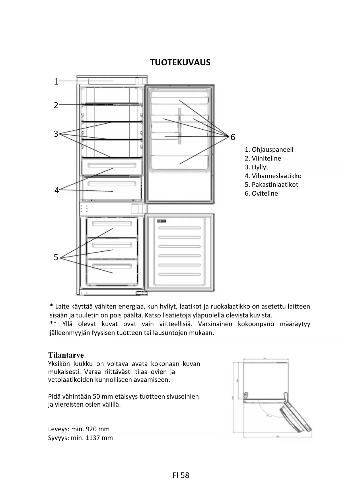 - Laite käyttää vähiten energiaa, kun hyllyt, laatikot ja ruokalaatikko on asetettu laitteen sisään ja tuuletin on pois päältä. Katso lisätietoja yläpuolella olevista kuvista. ** Yllä olevat kuvat ovat vain viitteellisiä. Varsinainen kokoonpano määräytyy jälleenmyyjän fyysisen tuotteen tai lausuntojen mukaan.Tilantarve Yksikön luukku on voitava avata kokonaan kuvan mukaisesti. Varaa riittävästi tilaa ovien ja vetolaatikoiden kunnolliseen avaamiseen. Pidä vähintään 50 mm etäisyys tuotteen sivuseinien ja viereisten osien välillä.Leveys: min. 920 mmSyvyys: min. 1137 mm1. Ohjauspaneeli2. Viiniteline3. Hyllyt4. Vihanneslaatikko5. Pakastinlaatikot6. Oviteline