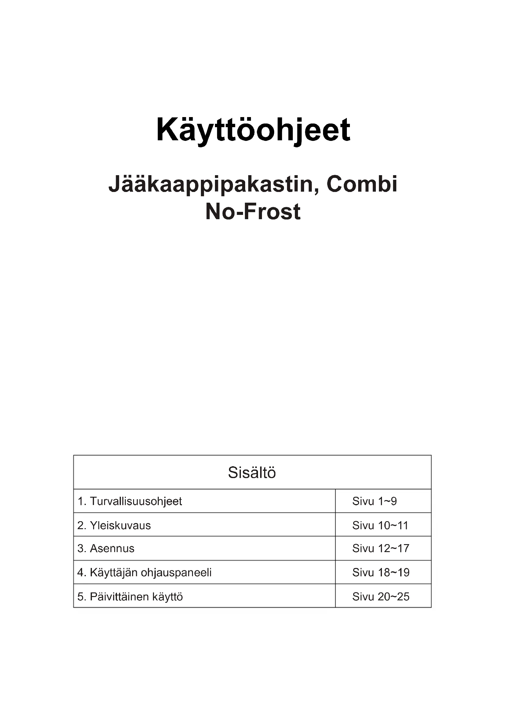 On suositeltavaa odottaa vähintään neljä tuntia ennen laitteen kytkemistä, jotta öljy virtaa takaisin kompressoriin. Laitteen ympäristössä on oltava sopiva ilmankierto. Muutoin laite voi ylikuumeta. Noudata asennusohjeita riittävän ilmanvaihdon takaamiseksi. Tuotteen välikappaleiden on mahdollisuuksien mukaan oltava seinää vasten, jotta lämpimät osat (kompressori, lauhdutin) eivät kosketa tai tartu niihin. Laitetta ei saa sijoittaa pattereiden tai keittimien lähelle. Varmista, että verkkopistokkeeseen päästään käsiksi asennuksen jälkeen. Huolto Laitteen huoltamiseen tarvittavat sähkötyöt on suori- tettava valtuutetun sähköasentajan tai pätevän henkilön toimesta. Tämän tuotteen saa huoltaa vain valtuutettu huolto- keskus ja vain alkuperäisiä varaosia saa käyttää. Energiansäästö Älä laita kuumaa ruokaa laitteeseen. Älä pakkaa ruokia lähekkäin, sillä se estää ilman kiertämisen. Varmista, että ruoka ei kosketa lokeron/lokeroiden takaosaa. Jos tulee sähkökatkos, älä avaa ovia. Älä avaa ovea/ovia usein. Älä pidä ovia/ovia auki liian pitkään.Turvallisuusohjeet