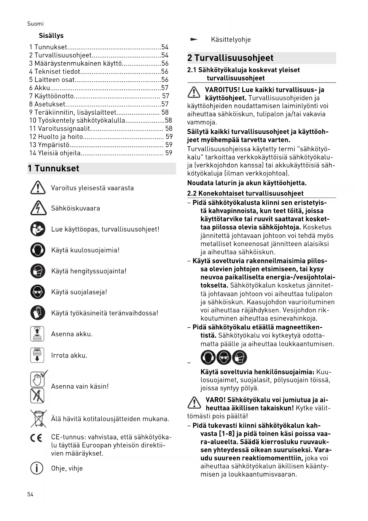 - 14 Yleisiä ohjeita 1 Tunnukset Varoitus yleisestä vaarasta Sähköiskuvaara Lue käyttöopas, turvallisuusohjeet! Käytä kuulosuojaimia! Käytä hengityssuojainta! Käytä suojalaseja! Käytä työkäsineitä teränvaihdossa! Asenna akku. Irrota akku. Asenna vain käsin! Älä hävitä kotitalousjätteiden mukana. CE-tunnus: vahvistaa, että sähkötyöka lu täyttää Euroopan yhteisön direktii vien määräykset. Ohje, vihje Käsittelyohje 2 Turvallisuusohjeet p. 59