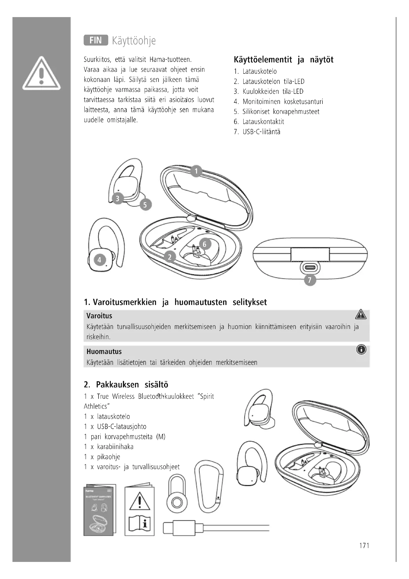 - Tuotteen käyttö rajoittaa ympäristön äänten havaitsemista Siksi käytön aikana ei saa ajaa ajoneuvolla tai käyttää koneita173