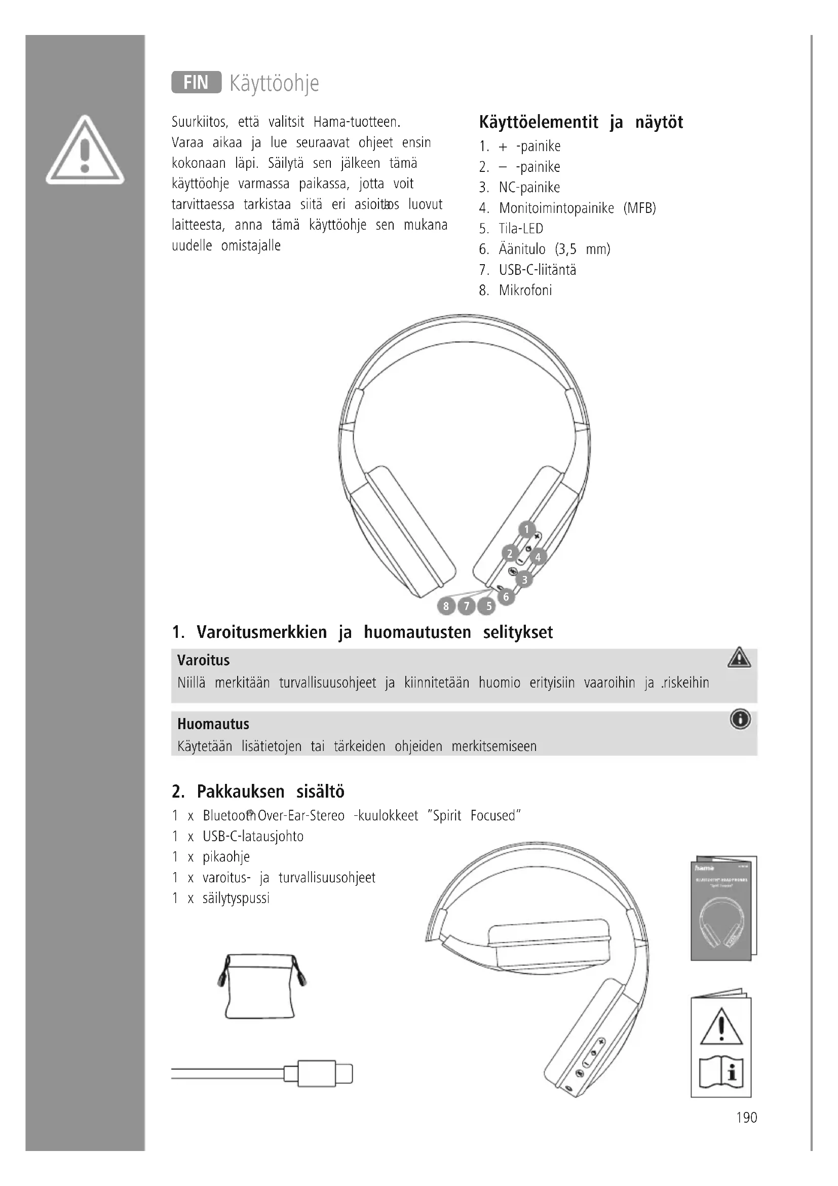 Over-Ear-Stereo -kuulokkeet ”Spirit Focused” 1 x USB-C-latausjohto 1 x pikaohje 1 x varoitus- ja turvallisuusohjeet 1 x säilytyspussi191