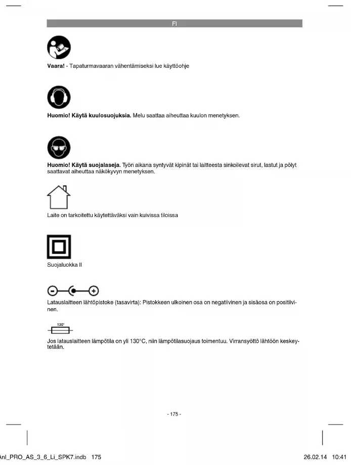 Vaara! - Tapaturmavaaran vähentämiseksi lue käyttöohje Huomio! Käytä kuulosuojuksia. Melu saattaa aiheuttaa kuulon menetyksen. Huomio! Käytä suojalaseja. Työn aikana syntyvät kipinät tai laitteesta sinkoilevat sirut, lastut ja pölyt saattavat aiheuttaa näkökyvyn menetyksen. Laite on tarkoitettu käytettäväksi vain kuivissa tiloissa Suojaluokka II Latauslaitteen lähtöpistoke (tasavirta): Pistokkeen ulkoinen osa on negatiivinen ja sisäosa on positiivi- nen. 130° Jos latauslaitteen lämpötila on yli 130°C, niin lämpötilasuojaus toimentuu. Virransyöttö lähtöön keskey- tetään. Anl_PRO_AS_3_6_Li_SPK7.indb 175Anl_PRO_AS_3_6_Li_SPK7.indb 175 26.02.14 10:4126.02.14 10:41FI