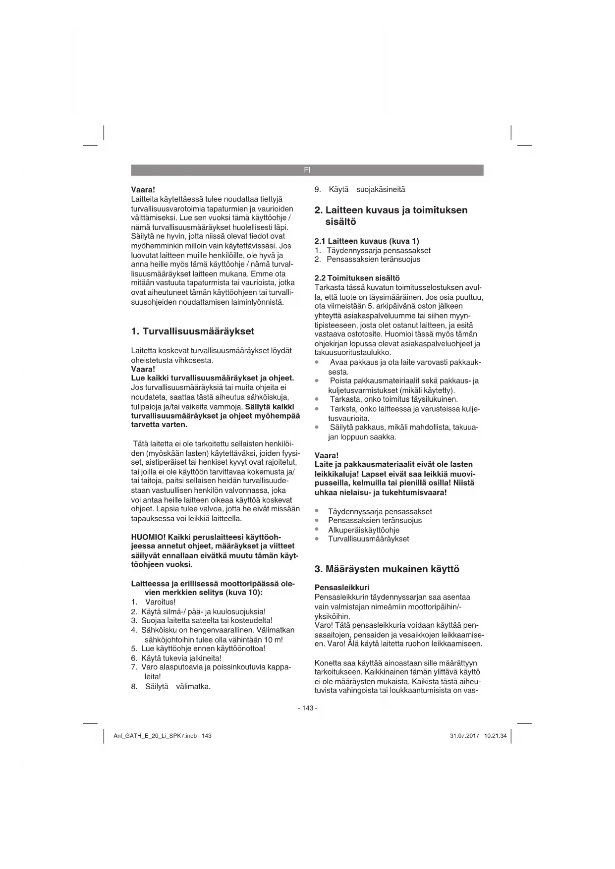 Pensasleikkuri Pensasleikkurin täydennyssarjan saa asentaa vain valmistajan nimeämiin moottoripäihin/- yksiköihin. Varo! Tätä pensasleikkuria voidaan käyttää pen- sasaitojen, pensaiden ja vesaikkojen leikkaamise- en. Varo! Älä käytä laitetta ruohon leikkaamiseen. Konetta saa käyttää ainoastaan sille määrättyyn tarkoitukseen. Kaikkinainen tämän ylittävä käyttö ei ole määräysten mukaista. Kaikista tästä aiheu- tuvista vahingoista tai loukkaantumisista on vas- Anl_GATH_E_20_Li_SPK7.indb 143Anl_GATH_E_20_Li_SPK7.indb 143 31.07.2017 10:21:3431.07.2017 10:21:34FI