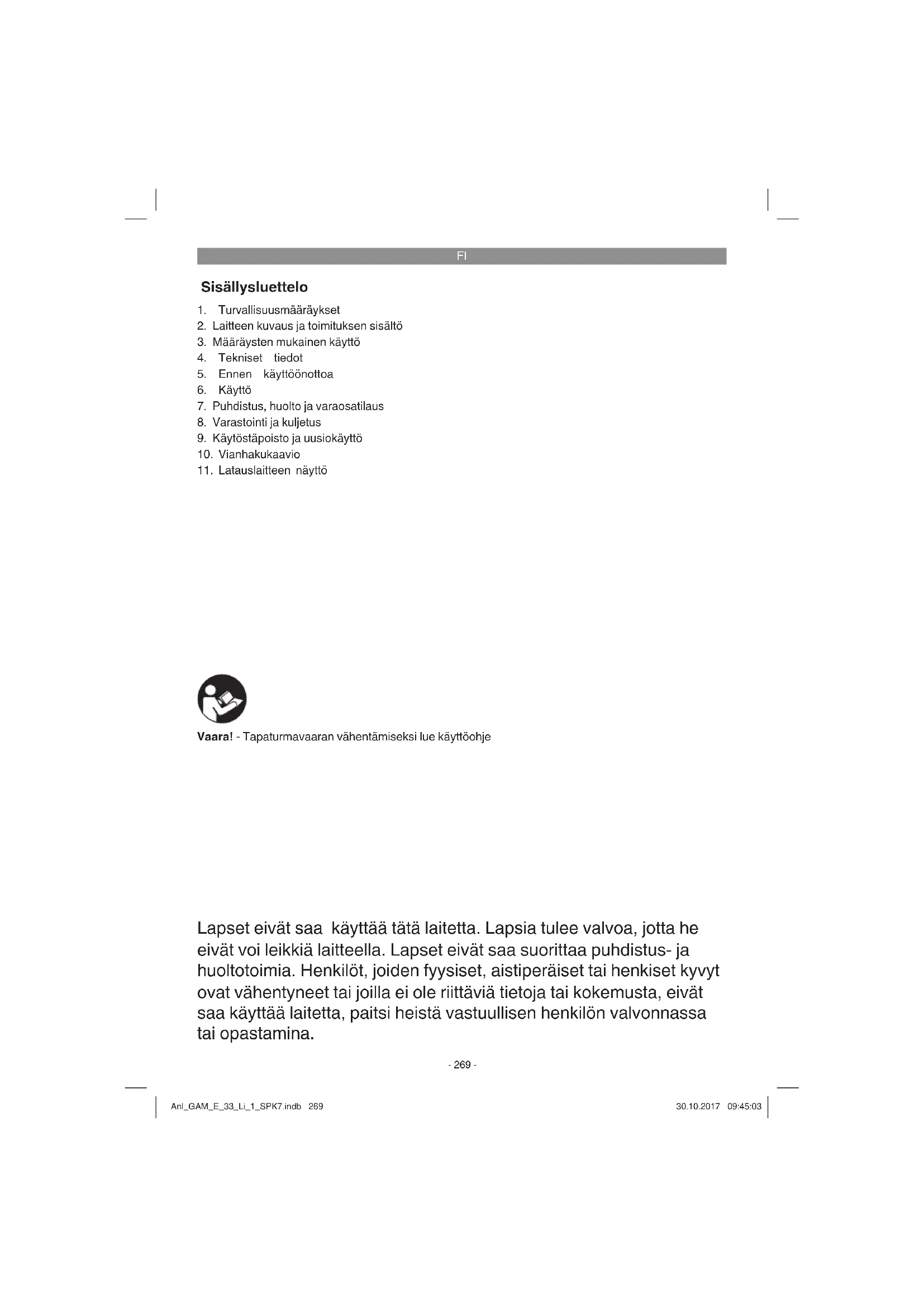 Lapset eivät saa käyttää tätä laitetta. Lapsia tulee valvoa, jotta he eivät voi leikkiä laitteella. Lapset eivät saa suorittaa puhdistus- ja huoltotoimia. Henkilöt, joiden fyysiset, aistiperäiset tai henkiset kyvyt ovat vähentyneet tai joilla ei ole riittäviä tietoja tai kokemusta, eivät saa käyttää laitetta, paitsi heistä vastuullisen henkilön valvonnassa tai opastamina. Vaara! - Tapaturmavaaran vähentämiseksi lue käyttöohje Anl_GAM_E_33_Li_1_SPK7.indb 269Anl_GAM_E_33_Li_1_SPK7.indb 269 30.10.2017 09:45:0330.10.2017 09:45:03FI