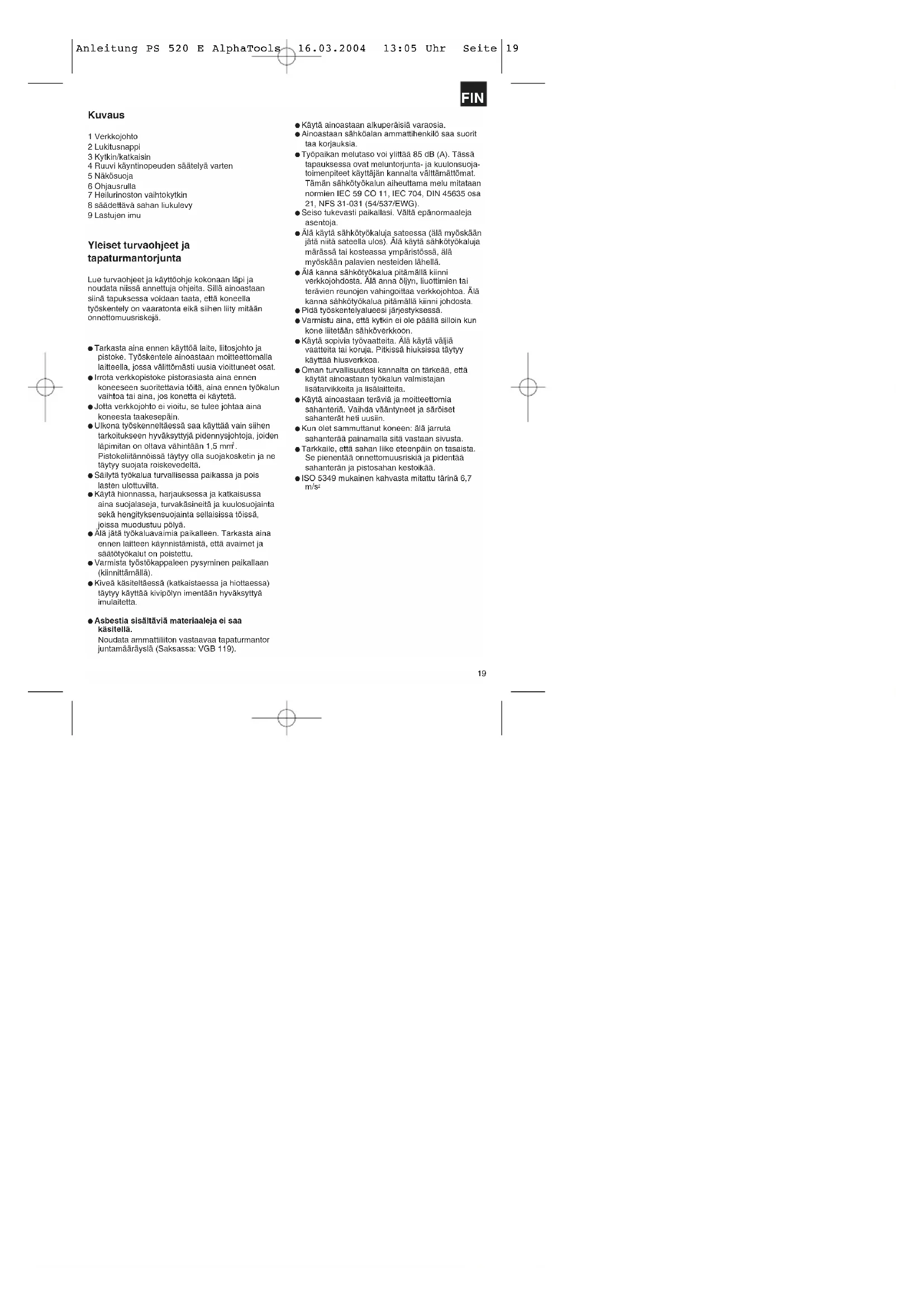 Anleitung PS 520 E AlphaTools 16.03.2004 13:05 Uhr Seite 1819 Kuvaus 1 Verkkojohto 2 Lukitusnappi 3 Kytkin/katkaisin 4 Ruuvi käyntinopeuden säätelyä varten 5 Näkösuoja 6 Ohjausrulla 7 Heilurinoston vaihtokytkin 8 säädettävä sahan liukulevy 9 Lastujen imu Yleiset turvaohjeet ja tapaturmantorjunta Lue turvaohjeet ja käyttöohje kokonaan läpi ja noudata niissä annettuja ohjeita. Sillä ainoastaan siinä tapuksessa voidaan taata, että koneella työskentely on vaaratonta eikä siihen liity mitään onnettomuusriskejä. Tarkasta aina ennen käyttöä laite, liitosjohto ja pistoke. Työskentele ainoastaan moitteettomalla laitteella, jossa välittömästi uusia vioittuneet osat. Irrota verkkopistoke pistorasiasta aina ennen koneeseen suoritettavia töitä, aina ennen työkalun vaihtoa tai aina, jos konetta ei käytetä. Jotta verkkojohto ei vioitu, se tulee johtaa aina koneesta taakesepäin. Ulkona työskenneltäessä saa käyttää vain siihen tarkoitukseen hyväksyttyjä pidennysjohtoja, joiden läpimitan on oltava vähintään 1,5 mm