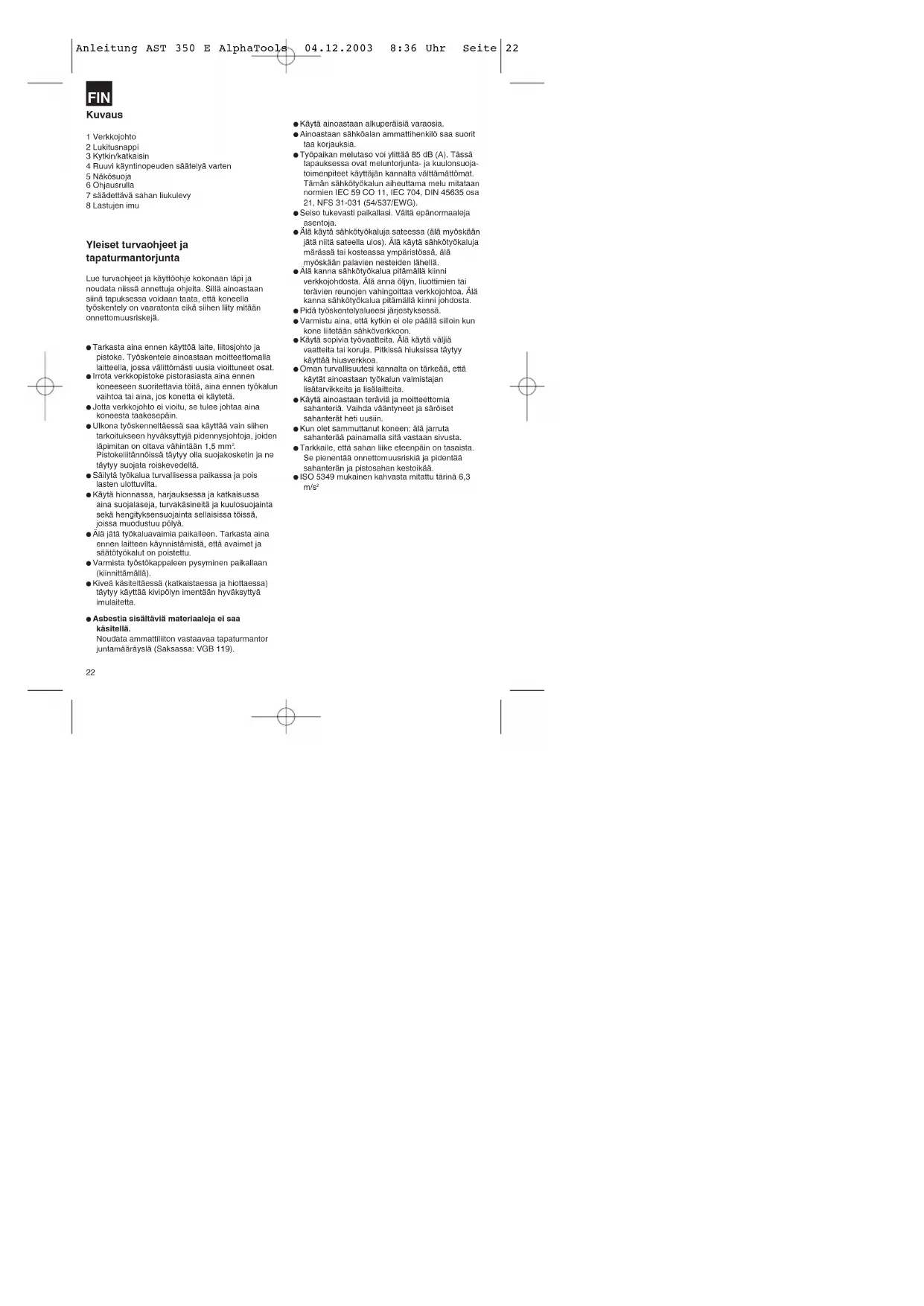 Modstykke Anleitung AST 350 E AlphaTools 04.12.2003 8:36 Uhr Seite 21Kuvaus 1 Verkkojohto 2 Lukitusnappi 3 Kytkin/katkaisin 4 Ruuvi käyntinopeuden säätelyä varten 5 Näkösuoja 6 Ohjausrulla 7 säädettävä sahan liukulevy 8 Lastujen imu Yleiset turvaohjeet ja tapaturmantorjunta Lue turvaohjeet ja käyttöohje kokonaan läpi ja noudata niissä annettuja ohjeita. Sillä ainoastaan siinä tapuksessa voidaan taata, että koneella työskentely on vaaratonta eikä siihen liity mitään onnettomuusriskejä. Tarkasta aina ennen käyttöä laite, liitosjohto ja pistoke. Työskentele ainoastaan moitteettomalla laitteella, jossa välittömästi uusia vioittuneet osat. Irrota verkkopistoke pistorasiasta aina ennen koneeseen suoritettavia töitä, aina ennen työkalun vaihtoa tai aina, jos konetta ei käytetä. Jotta verkkojohto ei vioitu, se tulee johtaa aina koneesta taakesepäin. Ulkona työskenneltäessä saa käyttää vain siihen tarkoitukseen hyväksyttyjä pidennysjohtoja, joiden läpimitan on oltava vähintään 1,5 mm