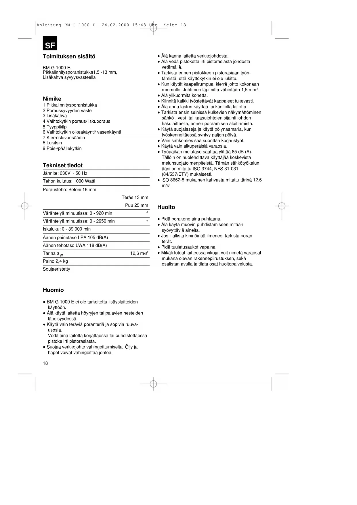 Paino 2,4 kg Soujaeristetty Huomio ● BM-G 1000 E ei ole tarkoitettu lisäyslaitteiden käyttöön. ● Älä käytä laitetta höyryjen tai palavien nesteiden läheisyydessä. ● Käytä vain teräviä poranteriä ja sopivia ruuva- usosia. Vedä aina laitetta korjattaessa tai puhdistettaessa pistoke irti pistorasiasta. ● Suojaa verkkojohto vahingoittumiselta. Öljy ja hapot voivat vahingoittaa johtoa. ● Älä kanna laitetta verkkojohdosta. ● Älä vedä pistoketta irti pistorasiasta johdosta vetämällä. ● Tarkista ennen pistokkeen pistorasiaan työn- tämistä, että käyttökytkin ei ole lukittu. ● Kun käytät kaapelirumpua, kierrä johto kokonaan rummulle. Johtimen läpimitta vähintään 1,5 mm