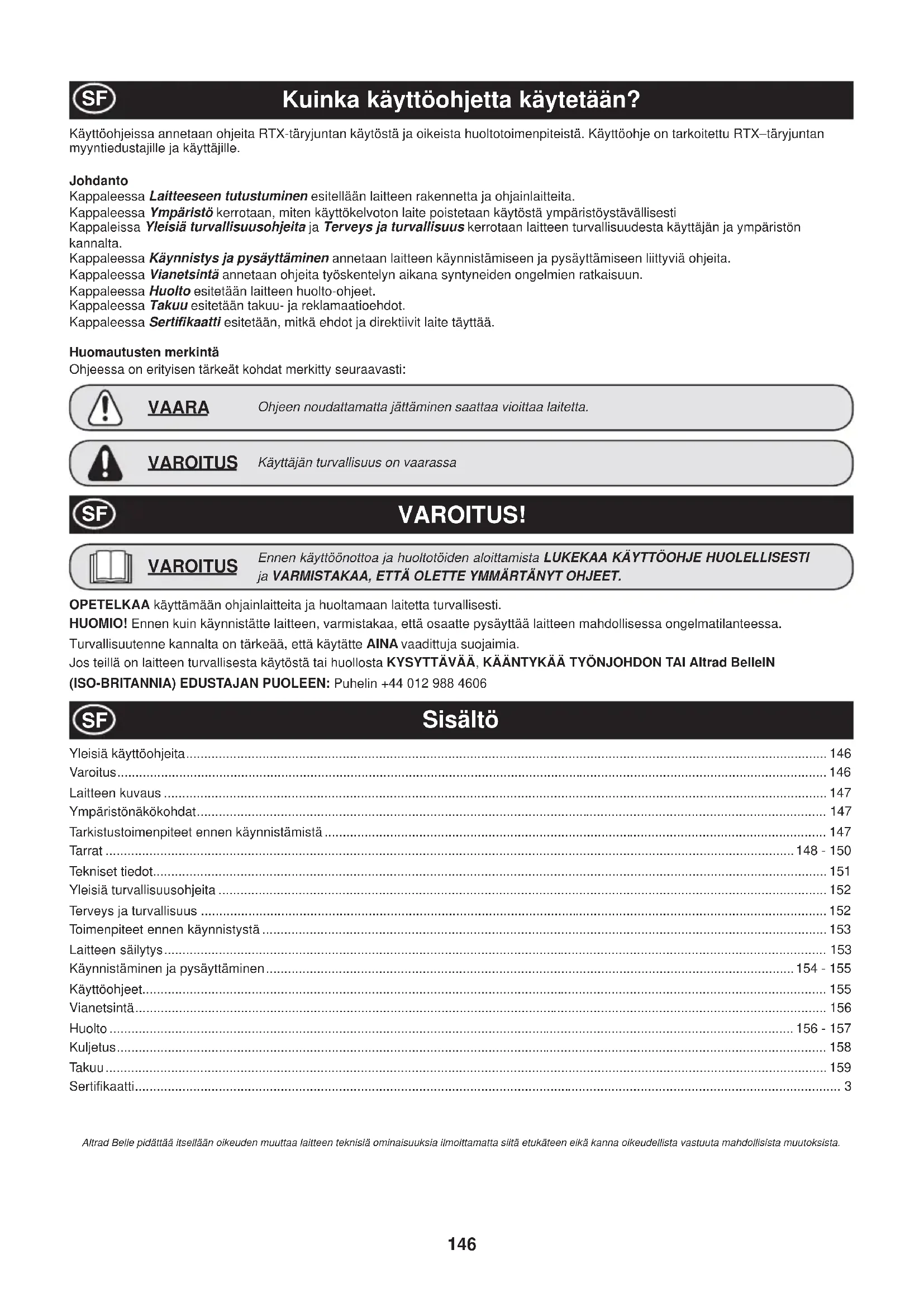Altrad Belle pidättää itsellään oikeuden muuttaa laitteen teknisiä ominaisuuksia ilmoittamatta siitä etukäteen eikä kanna oikeudellista vastuuta mahdollisista muutoksista. OPETELKAA käyttämään ohjainlaitteita ja huoltamaan laitetta turvallisesti. HUOMIO! Ennen kuin käynnistätte laitteen, varmistakaa, että osaatte pysäyttää laitteen mahdollisessa ongelmatilanteessa. Turvallisuutenne kannalta on tärkeää, että käytätte AINA vaadittuja suojaimia. Jos teillä on laitteen turvallisesta käytöstä tai huollosta KYSYTTÄVÄÄ, KÄÄNTYKÄÄ TYÖNJOHDON TAI Altrad BelleIN (ISO-BRITANNIA) EDUSTAJAN PUOLEEN: Puhelin +44 012 988 4606 SF147 Turvallinen varastointi Ympäristönsuojeluohjeet Laitteessa on arvokkaita kierrätettäviä materiaaleja. Viekää käyttökelvoton laite ja sen lisävarusteet kierrätettävien materiaalien vastaanottopisteeseen. Laitteen kuvaus