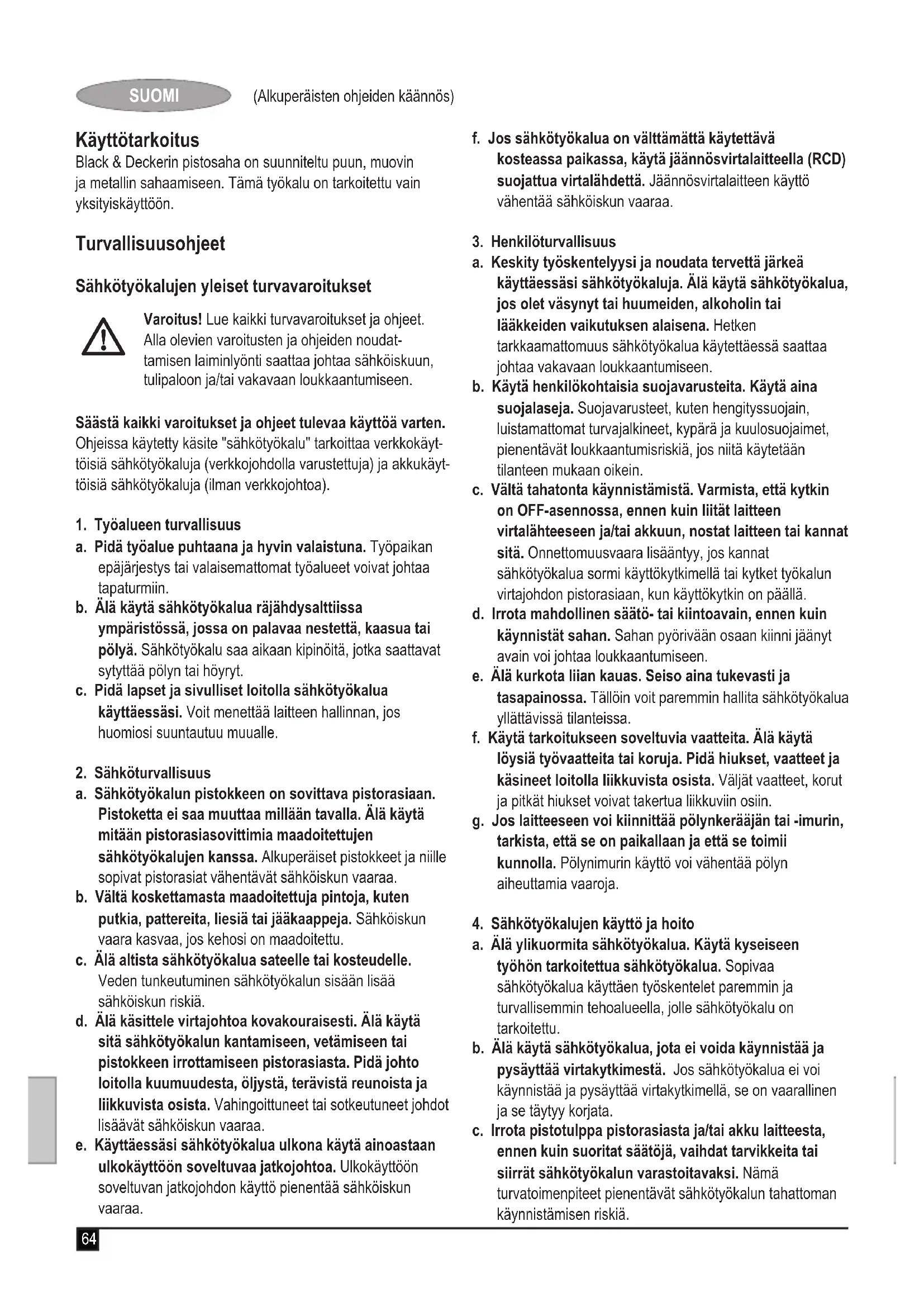 Kevin Hewitt Vice-President Global Engineering Black & Decker Europe, 210 Bath Road, Slough, Berkshire, SL1 3YD Yhdistynyt kuningaskunta 27/06/201169 (Alkuperäisten ohjeiden käännös) SUOMI Takuu Black & Decker takaa, ettei tuotteessa ole materiaali- ja/tai valmistusvikaa silloin, kun se toimitetaan ostajalle. Takuu on lisäys kuluttajan laillisiin oikeuksiin eikä vaikuta niihin. Takuu on voimassa Euroopan unionin jäsenmaissa ja Euroopan vapaakauppa-alueella (EFTA). Mikäli Black & Decker -kone hajoaa materiaali- ja/tai valm- istusvirheen tai teknisten tietojen epätarkkuuden vuoksi 24 kk:n kuluessa ostopäivästä, Black & Decker korjaa koneen ilman kustannuksia ostajalle tai vaihtaa sen Black & Decker Oy:n valinnan mukaan. Takuu ei kata vikoja, jotka johtuvat seuraavista: u Tuotetta on käytetty kaupallisesti, ammattimaisesti tai vuokraukseen. u Tuotetta on käytetty tai hoidettu virheellisesti. u Tuotetta on vahingoitettu vieraalla esineellä tai aineella tai se on ollut onnettomuudessa. u Jos korjauksia on yrittänyt joku muu kuin Black & Deckerin valtuuttama edustaja tai Black & Deckerin henkilökunta. Edellytyksenä takuun saamiselle on, että ostaja jättää koneen ja ostokuitin jälleenmyyjälle tai valtuutetulle huoltoliikkeelle. Saat valtuutettujen huoltoliikkeiden yhteystiedot ottamalla yhteyden Black & Decker Oy:hyn tässä käyttöoppaassa ilmoitetussa osoitteessa. Valtuutettujen Black & Decker -huol- toliikkeiden yhteystiedot sekä lisätietoja palveluistamme ja takuuehdoista on myös Internetissä osoitteessa www.2helpU. com Voit rekisteröidä uuden Black & Decker -tuotteesi ja tarkastella tietoja uusista tuotteista ja erikoistarjouksista verkkosivuil- lamme www.blackanddecker.. Saat lisätietoja Black & Deckerin tavaramerkistä ja tuotevalikoimastamme osoitteesta www.blackanddecker..70 (Μετάφραση των πρωτότυπων οδηγιών) Ενδεδειγμένη χρήση Η σέγα σας Black & Decker έχει σχεδιαστεί για το πριόνισμα ξύλου, πλαστικών και μετάλλου. Αυτό το εργαλείο προορίζεται μόνο για ερασιτεχνική χρήση. Οδηγίες ασφαλείας Γενικές προειδοποιήσεις ασφαλείας για τα ηλεκτρικά εργαλεία