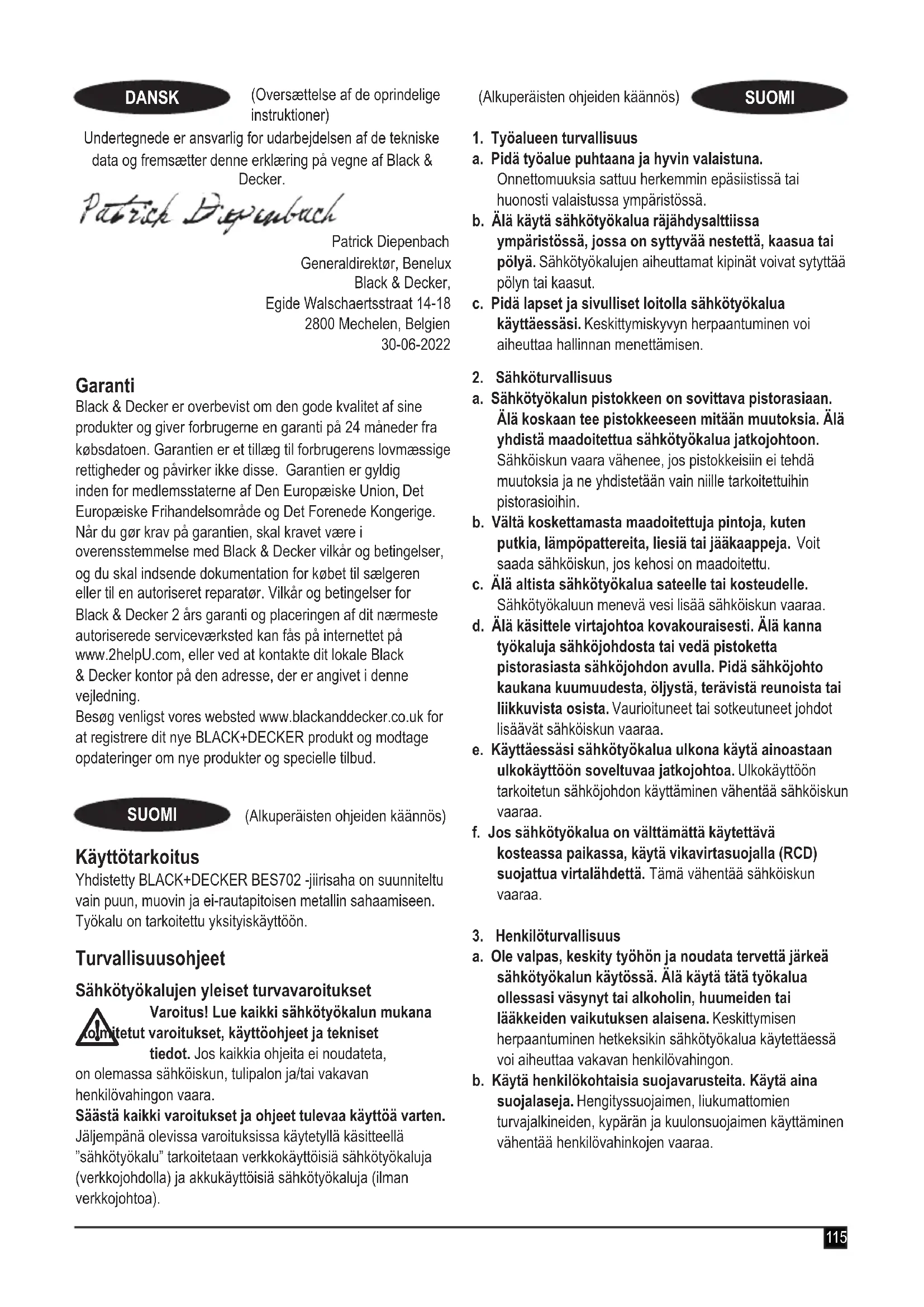 Nämä tuotteet täyttävät myös direktiivien 2014/30/EU ja 2011/65/EU vaatimukset. Lisätietoja saa ottamalla yhteyden Black & Deckeriin seuraavassa osoitteessa. Tiedot ovat myös käyttöohjeen takakannessa. Allekirjoittanut vastaa teknisten tietojen kokoamisesta tehden tämän ilmoituksen Black & Deckerin puolesta. Patrick Diepenbach Pääjohtaja, Benelux Black & Decker, Egide Walschaertsstraat 14-18 2800 Mechelen, Belgia
