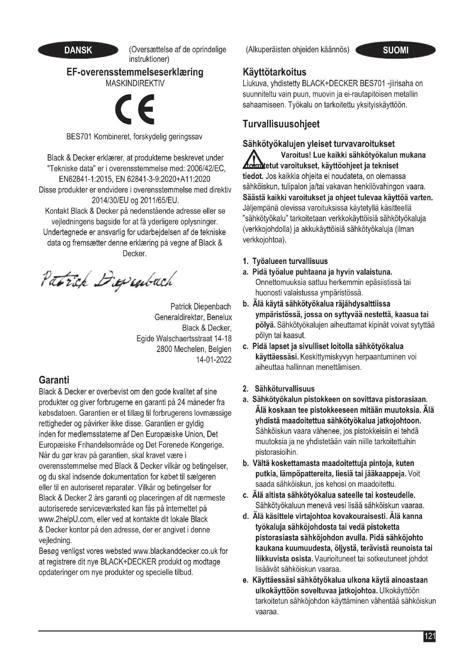 BES701 Liukuva yhdistelmäjiirisaha Black & Decker ilmoittaa, että Tekniset tiedot -kohdassa kuvatut tuotteet täyttävät seuraavien direktiivien vaatimukset: 2006/42/EY, EN62841-1:2015, EN 62841-3-9:2020+A11:2020 Nämä tuotteet täyttävät myös direktiivien 2014/30/EU ja 2011/65/EU vaatimukset. Lisätietoja saa ottamalla yhteyden Black & Deckeriin seuraavassa osoitteessa. Tiedot ovat myös käyttöohjeen takakannessa. Allekirjoittanut vastaa teknisten tietojen kokoamisesta tehden tämän ilmoituksen Black & Deckerin puolesta. Patrick Diepenbach Pääjohtaja, Benelux Black & Decker, Egide Walschaertsstraat 14-18 2800 Mechelen, Belgia