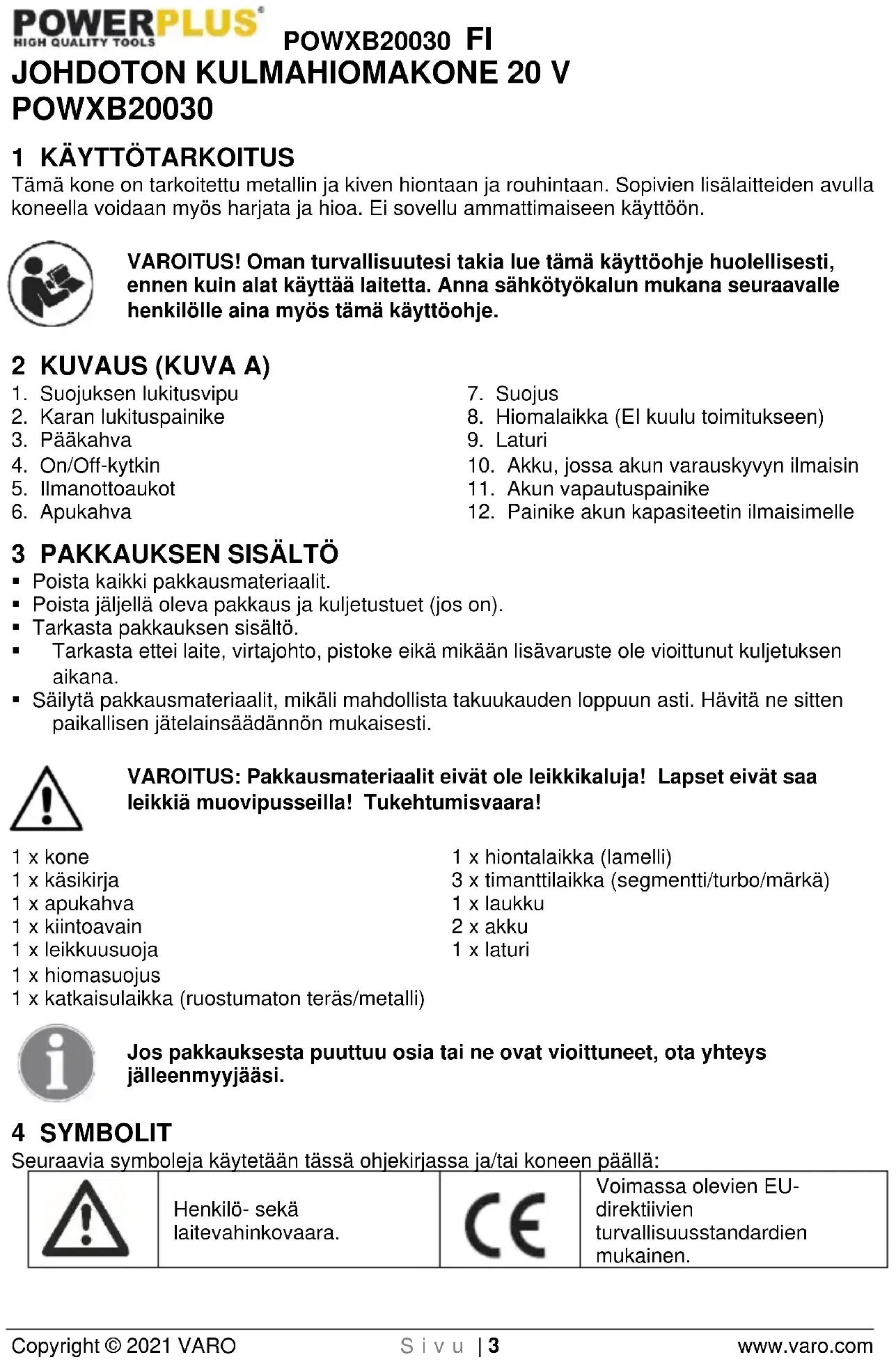 Voimassa olevien EU- direktiivien turvallisuusstandardien mukainen.POWXB20030 FI Copyright © 2021 VARO S i v u | 4 www.varo.com