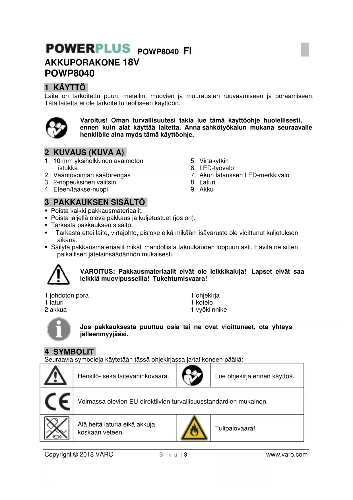 Copyright © 2018 VARO S i v u | 3 www.varo.com AKKUPORAKONE 18V POWP8040 1 KÄYTTÖ Laite on tarkoitettu puun, metallin, muovien ja muurausten ruuvaamiseen ja poraamiseen. Tätä laitetta ei ole tarkoitettu teolliseen käyttöön. Varoitus! Oman turvallisuutesi takia lue tämä käyttöohje huolellisesti, ennen kuin alat käyttää laitetta. Anna sähkötyökalun mukana seuraavalle henkilölle aina myös tämä käyttöohje. 2 KUVAUS (KUVA A)
