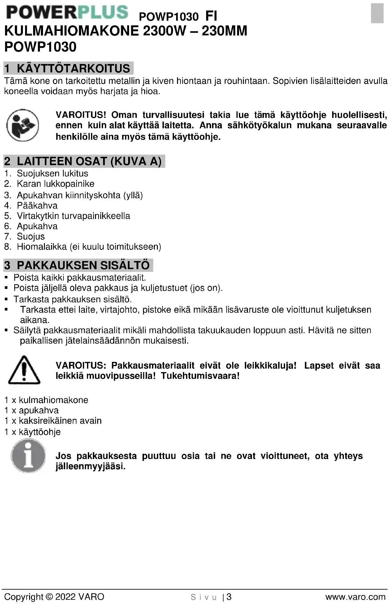 - Korjauta laitteesi ainoastaan pätevällä ammattihenkilöllä, joka käyttää vain alkuperäisiä varaosia. Näin varmistat, että laitteesi on turvallinen sitä käytettäessä.POWP1030 FI Copyright © 2022 VARO S i v u | 6 www.varo.com