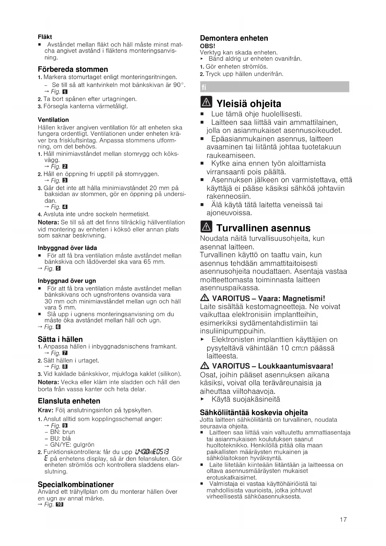Yleisiä ohjeita ¡ Lue tämä ohje huolellisesti. ¡ Laitteen saa liittää vain ammattilainen, jolla on asianmukaiset asennusoikeudet. ¡ Epäasianmukainen asennus, laitteen avaaminen tai liitäntä johtaa tuotetakuun raukeamiseen. ¡ Kytke aina ennen työn aloittamista virransaanti pois päältä. ¡ Asennuksen jälkeen on varmistettava, että käyttäjä ei pääse käsiksi sähköä johtaviin rakenneosiin. ¡ Älä käytä tätä laitetta veneissä tai ajoneuvoissa. Turvallinen asennus Noudata näitä turvallisuusohjeita, kun asennat laitteen. Turvallinen käyttö on taattu vain, kun asennus tehdään ammattitaitoisesti asennusohjeita noudattaen. Asentaja vastaa moitteettomasta toiminnasta laitteen asennuspaikassa. VAROITUS‒Vaara: Magnetismi! Laite sisältää kestomagneetteja. Ne voivat vaikuttaa elektronisiin implantteihin, esimerkiksi sydämentahdistimiin tai insuliinipumppuihin. ▶ Elektronisten implanttien käyttäjien on pysyteltävä vähintään 10cm:n päässä laitteesta. VAROITUS‒Loukkaantumisvaara! Osat, joihin pääset asennuksen aikana käsiksi, voivat olla teräväreunaisia ja aiheuttaa viiltohaavoja. ▶ Käytä suojakäsineitä Sähköliitäntää koskevia ohjeita Jotta laitteen sähköliitäntä on turvallinen, noudata seuraavia ohjeita. ¡ Laitteen saa liittää vain valtuutettu ammattiasentaja tai asianmukaisen koulutuksen saanut huoltoteknikko. Henkilöllä pitää olla maan paikallisten määräysten mukainen ja sähkölaitoksen hyväksyntä. ¡ Laite liitetään kiinteään liitäntään ja laitteessa on oltava asennusmääräysten mukaiset erotuskatkaisimet. ¡ Valmistaja ei vastaa käyttöhäiriöistä tai mahdollisista vaurioista, jotka johtuvat virheellisestä sähköasennuksesta.18 Liitäntätyyppi ¡ Laitteen suojaluokka on 1. Laitteen käyttö on siten sallittu vain maadoitusliitännän kanssa. Kalusteita koskevia huomautuksia ¡ Voit asentaa induktiokeittotason vain vetolaatikon tai puhallintuuletuksella varustetun uunin yläpuolelle. Älä asenna keittotason alapuolelle jääkaappia, astianpesukonetta, tuulettamatonta uunia tai pyykinpesukonetta. ¡ Varmista, että kaluste kestää kuumuutta vähintään 90°C saakka. Työtaso Noudata työtason valmistajan suosituksia. ¡ Tasainen, vaakatasossa oleva, vakaa. ¡ Työtason, johon laite asennetaan, pitää kestää n. 60kg:n kuormitus. ¡ Käytä ohuiden työtasojen kohdalla kuumuutta ja kosteutta kestävää vahvikemateriaalia. ¡ Tarkasta keittotason pinnan tasaisuus vasta, kun se on asennettu paikalleen. Liesituuletin ¡ Liesituulettimen ja keittotason välisen etäisyyden pitää olla vähintään liesituulettimen asennusohjeessa annetun etäisyyden mukainen. Kalusteiden esivalmistelu