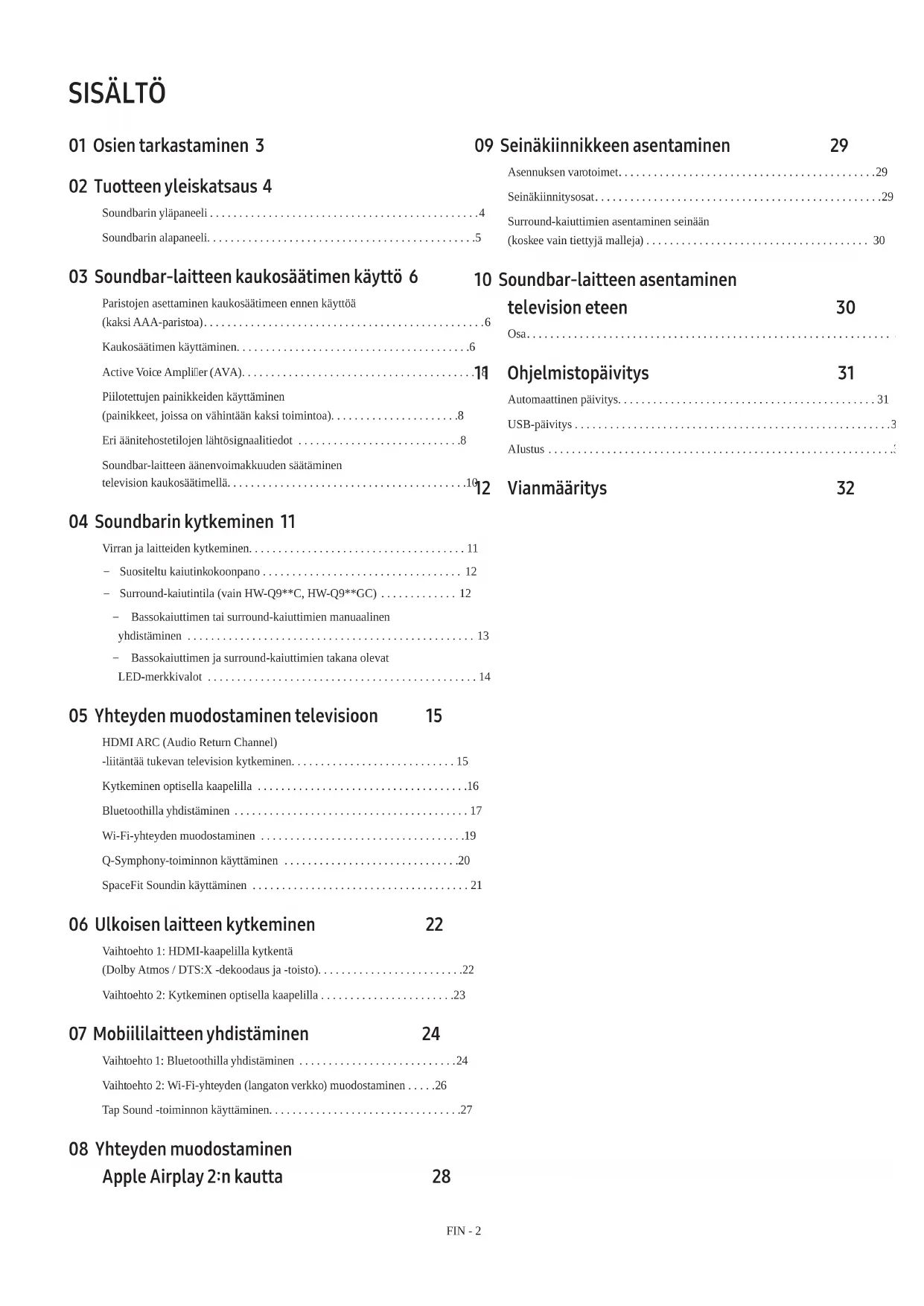 - Soundbar ühildub AirPlay2-ga, mis on installitud iOS 13.4 või uuemasse versiooni.FIN - 2 SISÄLTÖ 01 Osien tarkastaminen 3 02 Tuotteen yleiskatsaus 4 Soundbarin yläpaneeli . . . . . . . . . . . . . . . . . . . . . . . . . . . . . . . . . . . . . . . . . . . . . .4 Soundbarin alapaneeli. . . . . . . . . . . . . . . . . . . . . . . . . . . . . . . . . . . . . . . . . . . . . .5 03 Soundbar-laitteen kaukosäätimen käyttö 6 Paristojen asettaminen kaukosäätimeen ennen käyttöä (kaksi AAA-paristoa). . . . . . . . . . . . . . . . . . . . . . . . . . . . . . . . . . . . . . . . . . . . . . . .6 Kaukosäätimen käyttäminen. . . . . . . . . . . . . . . . . . . . . . . . . . . . . . . . . . . . . . . .6 Active Voice Amplier (AVA). . . . . . . . . . . . . . . . . . . . . . . . . . . . . . . . . . . . . . . . .8 Piilotettujen painikkeiden käyttäminen (painikkeet, joissa on vähintään kaksi toimintoa). . . . . . . . . . . . . . . . . . . . . .8 Eri äänitehostetilojen lähtösignaalitiedot . . . . . . . . . . . . . . . . . . . . . . . . . . . .8 Soundbar-laitteen äänenvoimakkuuden säätäminen television kaukosäätimellä. . . . . . . . . . . . . . . . . . . . . . . . . . . . . . . . . . . . . . . . .10 04 Soundbarin kytkeminen 11 Virran ja laitteiden kytkeminen. . . . . . . . . . . . . . . . . . . . . . . . . . . . . . . . . . . . . 11 ‒ Suositeltu kaiutinkokoonpano . . . . . . . . . . . . . . . . . . . . . . . . . . . . . . . . . . 12 ‒ Surround-kaiutintila (vain HW-Q9**C, HW-Q9**GC) . . . . . . . . . . . . . 12 ‒ Bassokaiuttimen tai surround-kaiuttimien manuaalinen yhdistäminen . . . . . . . . . . . . . . . . . . . . . . . . . . . . . . . . . . . . . . . . . . . . . . . . . 13 ‒ Bassokaiuttimen ja surround-kaiuttimien takana olevat LED-merkkivalot . . . . . . . . . . . . . . . . . . . . . . . . . . . . . . . . . . . . . . . . . . . . . . 14 05 Yhteyden muodostaminen televisioon 15 HDMI ARC (Audio Return Channel) -liitäntää tukevan television kytkeminen. . . . . . . . . . . . . . . . . . . . . . . . . . . . 15 Kytkeminen optisella kaapelilla . . . . . . . . . . . . . . . . . . . . . . . . . . . . . . . . . . . .16 Bluetoothilla yhdistäminen . . . . . . . . . . . . . . . . . . . . . . . . . . . . . . . . . . . . . . . . 17 Wi-Fi-yhteyden muodostaminen . . . . . . . . . . . . . . . . . . . . . . . . . . . . . . . . . . .19 Q-Symphony-toiminnon käyttäminen . . . . . . . . . . . . . . . . . . . . . . . . . . . . . .20 SpaceFit Soundin käyttäminen . . . . . . . . . . . . . . . . . . . . . . . . . . . . . . . . . . . . . 21 06 Ulkoisen laitteen kytkeminen 22 Vaihtoehto 1: HDMI-kaapelilla kytkentä (Dolby Atmos / DTS:X -dekoodaus ja -toisto). . . . . . . . . . . . . . . . . . . . . . . . .22 Vaihtoehto 2: Kytkeminen optisella kaapelilla . . . . . . . . . . . . . . . . . . . . . . .23 07 Mobiililaitteen yhdistäminen 24 Vaihtoehto 1: Bluetoothilla yhdistäminen . . . . . . . . . . . . . . . . . . . . . . . . . . .24 Vaihtoehto 2: Wi-Fi-yhteyden (langaton verkko) muodostaminen . . . . .26 Tap Sound -toiminnon käyttäminen. . . . . . . . . . . . . . . . . . . . . . . . . . . . . . . . .27 08 Yhteyden muodostaminen Apple Airplay 2:n kautta 28 09 Seinäkiinnikkeen asentaminen 29 Asennuksen varotoimet. . . . . . . . . . . . . . . . . . . . . . . . . . . . . . . . . . . . . . . . . . . .29 Seinäkiinnitysosat. . . . . . . . . . . . . . . . . . . . . . . . . . . . . . . . . . . . . . . . . . . . . . . . .29 Surround-kaiuttimien asentaminen seinään (koskee vain tiettyjä malleja) . . . . . . . . . . . . . . . . . . . . . . . . . . . . . . . . . . . . . . 30 10 Soundbar-laitteen asentaminen television eteen 30 Osa. . . . . . . . . . . . . . . . . . . . . . . . . . . . . . . . . . . . . . . . . . . . . . . . . . . . . . . . . . . . . . 30 11 Ohjelmistopäivitys 31 Automaattinen päivitys. . . . . . . . . . . . . . . . . . . . . . . . . . . . . . . . . . . . . . . . . . . . 31 USB-päivitys . . . . . . . . . . . . . . . . . . . . . . . . . . . . . . . . . . . . . . . . . . . . . . . . . . . . . .31 AIustus . . . . . . . . . . . . . . . . . . . . . . . . . . . . . . . . . . . . . . . . . . . . . . . . . . . . . . . . . . .32 12 Vianmääritys 32FIN - 3 01 OSIEN TARKASTAMINEN SOUNDBAR Soundbar-päälaite Soundbar-kaukosäädin ja paristot Bassokaiutin POWER x 2 x 4 tai 2 Surround-kaiutin (valinnainen) (vasen/oikea) Virtajohto (bassokaiutin, surround-kaiutin, Soundbar) (valinnainen) HDMI-kaapeli x 2 x 2 (M4 x L10) Seinäkiinnitin Pidikeruuvi Ruuvi x 2 x 4 Seinäkiinnitinkannatin Kumitassu