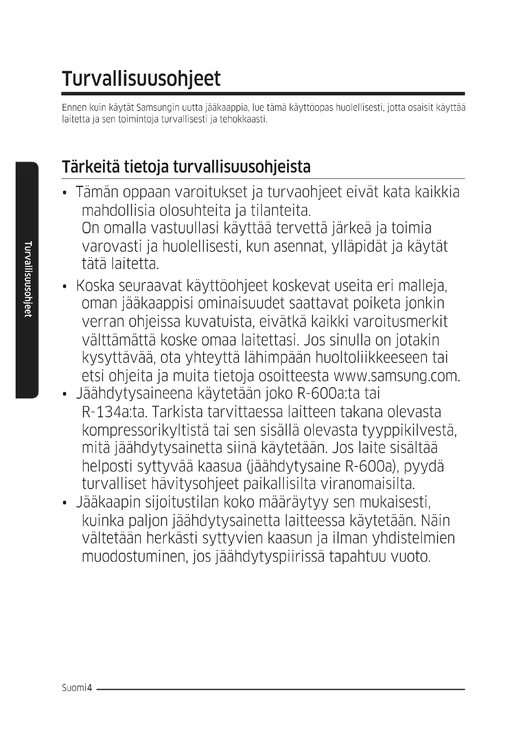 - Jos jääkaappiin on päässyt pölyä tai vettä, irrota pistoke pistorasiasta ja ota yhteyttä lähimpään Samsung Electronicsin huoltoliikkeeseen. - On olemassa tulipalon vaara.Suomi 15 Turvallisuusohjeet